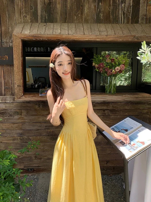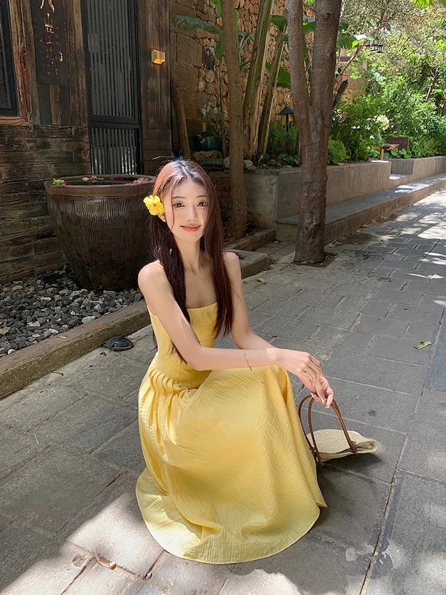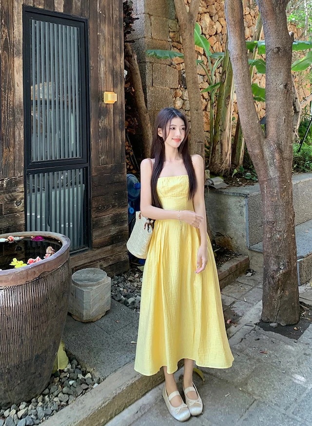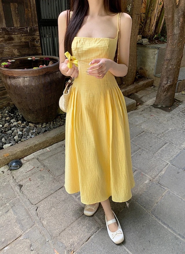 ヘビロテ キャミワンピース ミモレ丈 キャミソール ノースリーブ Aライン ゆったり 夏 イエロー 黄色 単色 南国 リゾート 韓国ファッション レディース おしゃれ かわいい カジュアル お出かけ