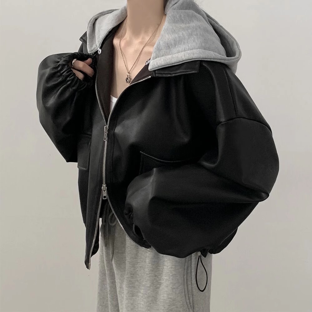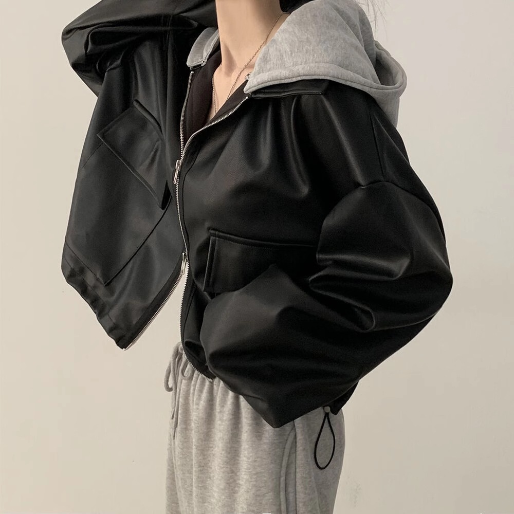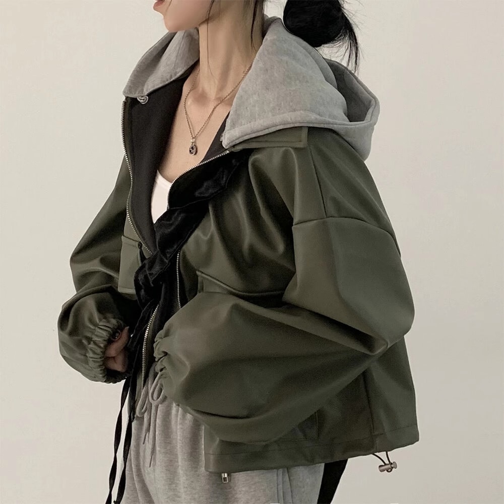ライダースジャケット秋アウターフード付きショートpu レザージャケット 韓国ファッション 流行りトップス 革ジャンレディース クライダースジャケットコート 秋ジャケット