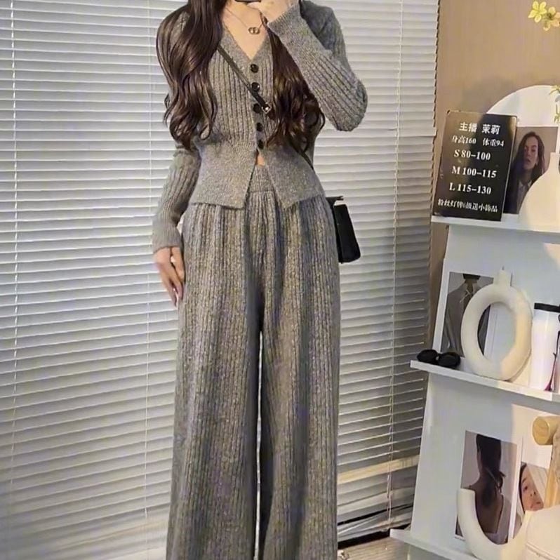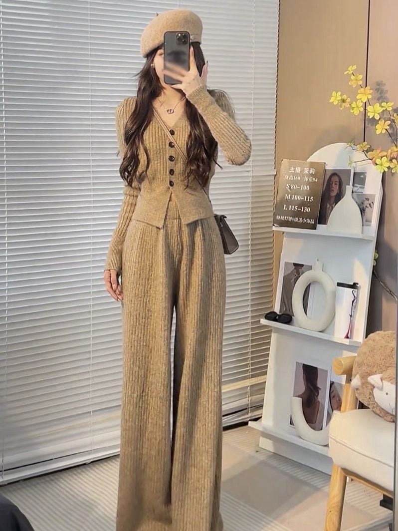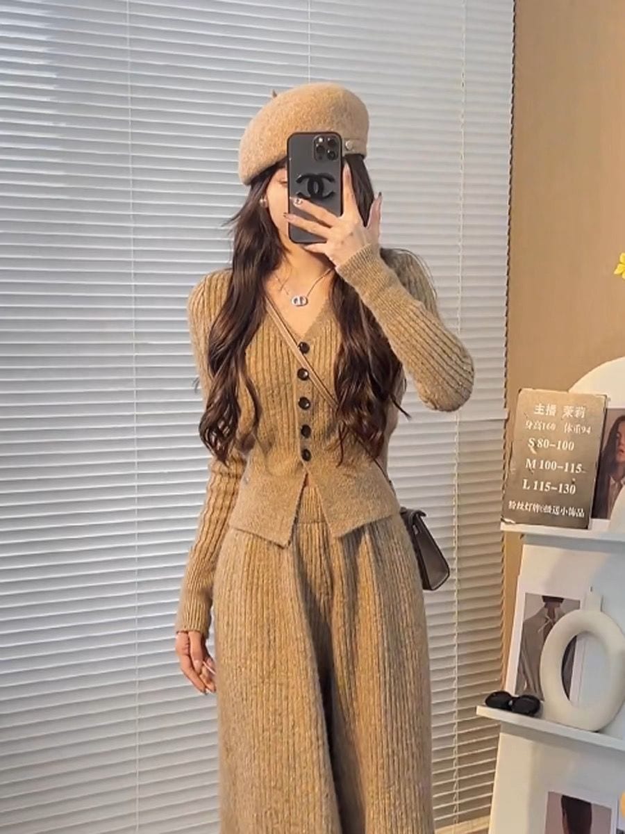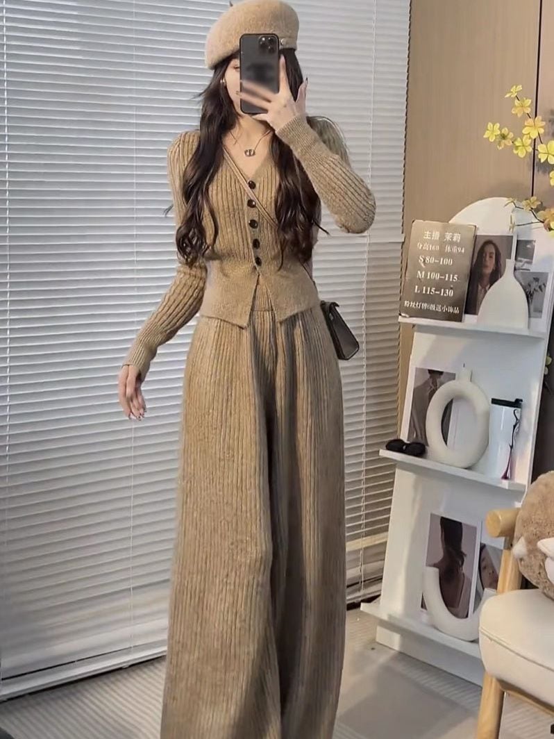 ニットセット vネック 上下セット トップス+パンツ カジュアル 3色 レディース セットアップ セットアップ