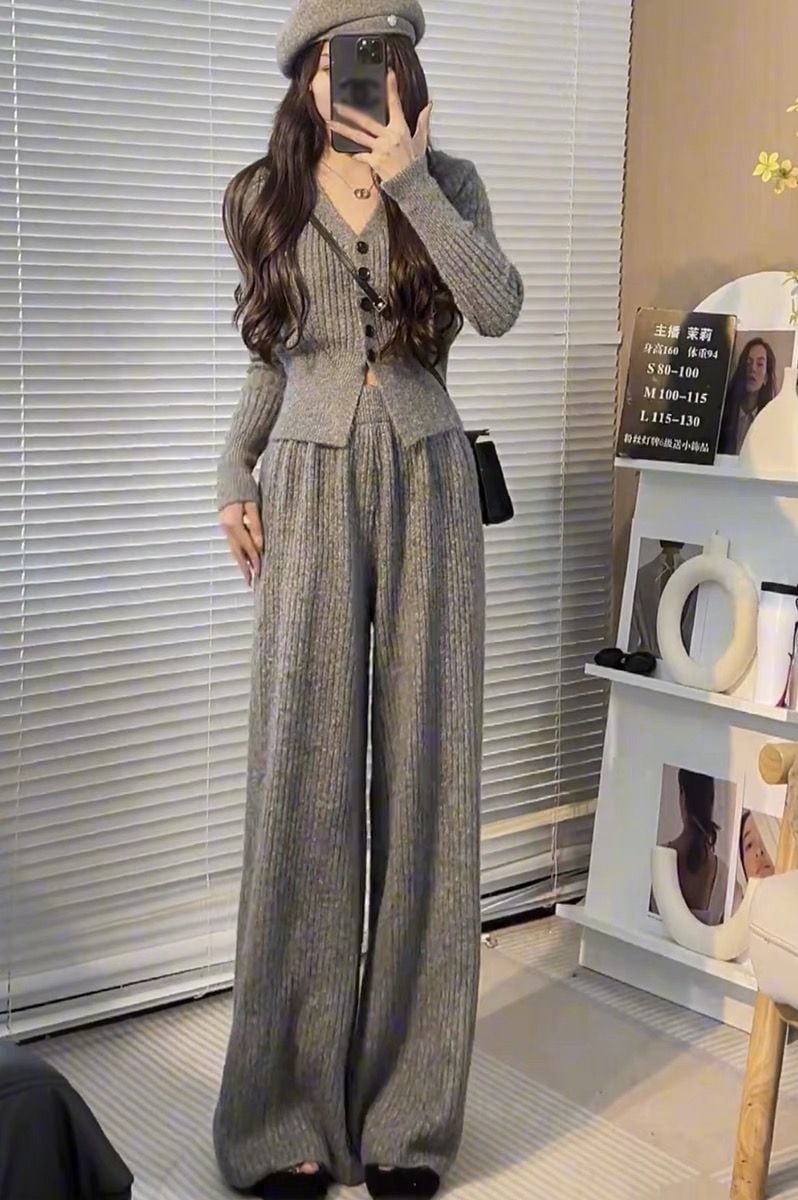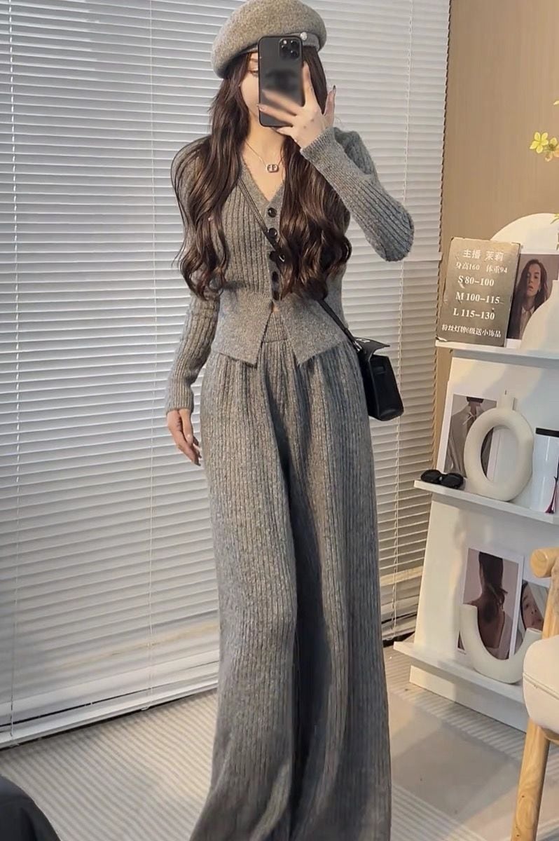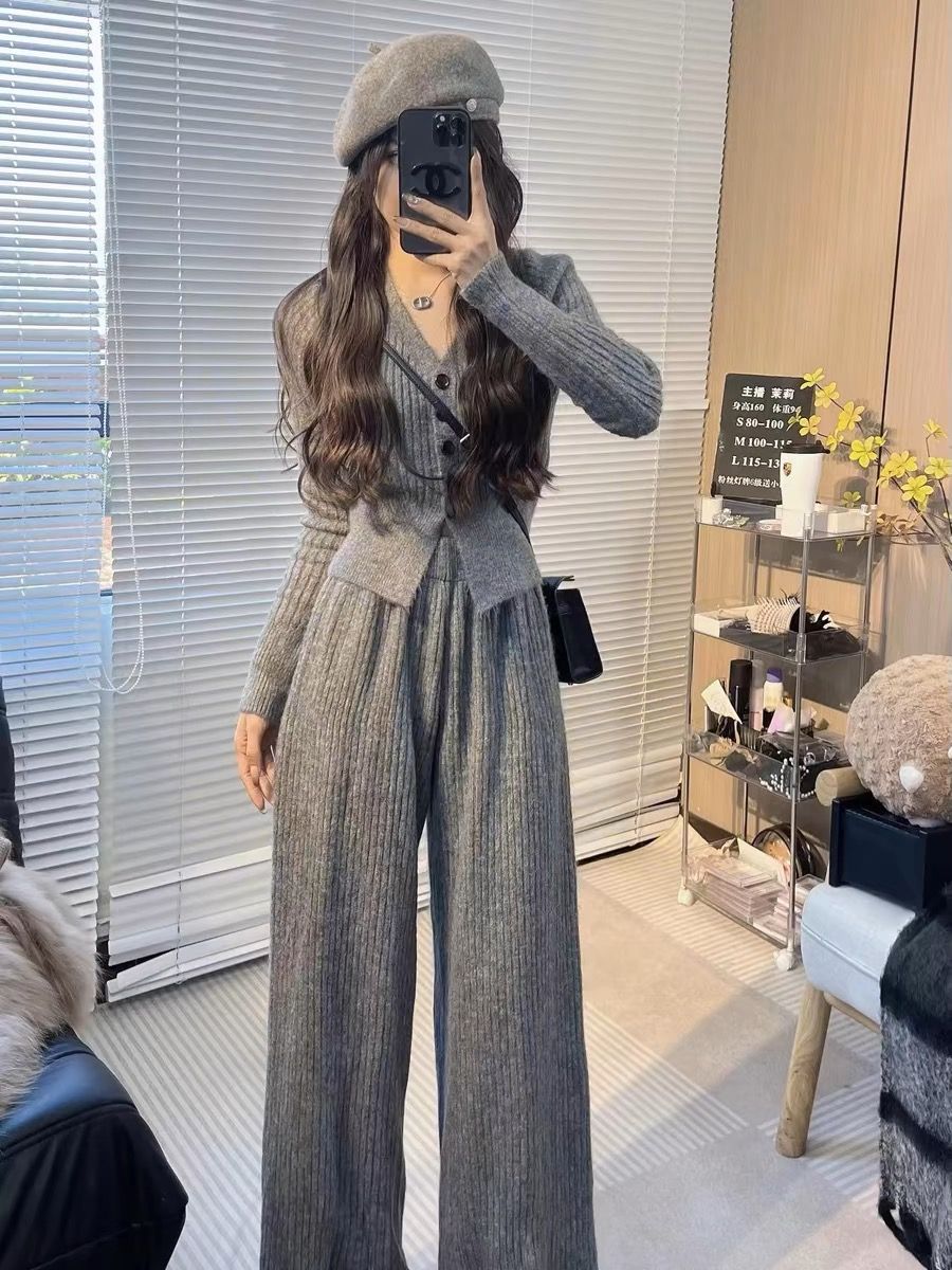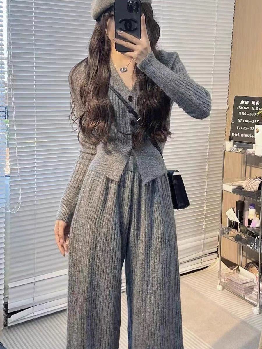 ニットセット vネック 上下セット トップス+パンツ カジュアル 3色 レディース セットアップ セットアップ