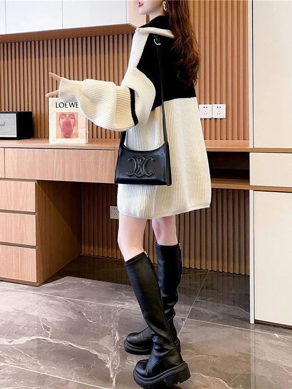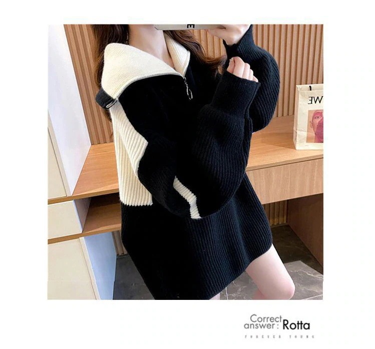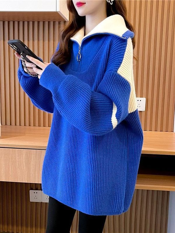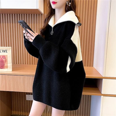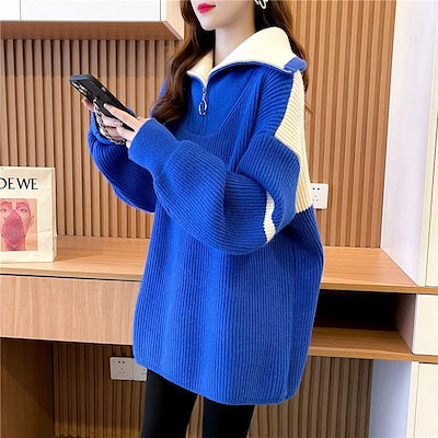 厚手 セミロング タートルネック polo セーター レディース ゆったり 怠惰風 ジ ップアップ コントラストカラー 上着 ニットカーディガン