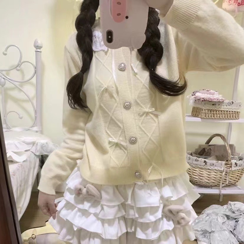 蝶ネクタイレースの縁にセーターをつなぎ合わせた女性コート秋冬の新型菱形デザイン感ニットカーディガン カーディガン