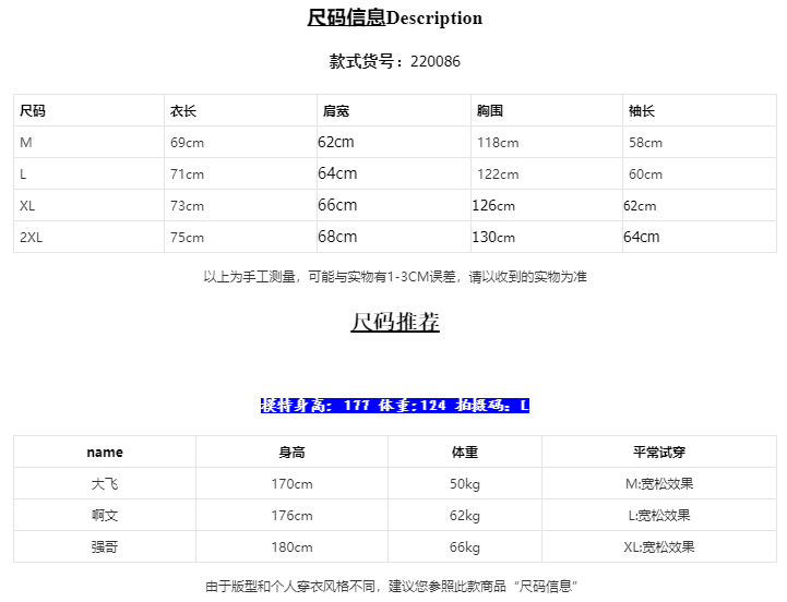 尺码: 2XL M L XL