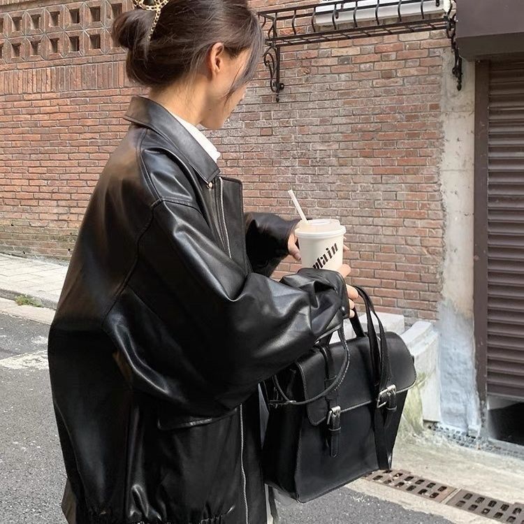 ジャンパー ブルゾン ブラウンのフェイクレザーコート女2025新型秋の高級ゆったりアメリカンレトロな機関車ジャケット ライダースジャケット