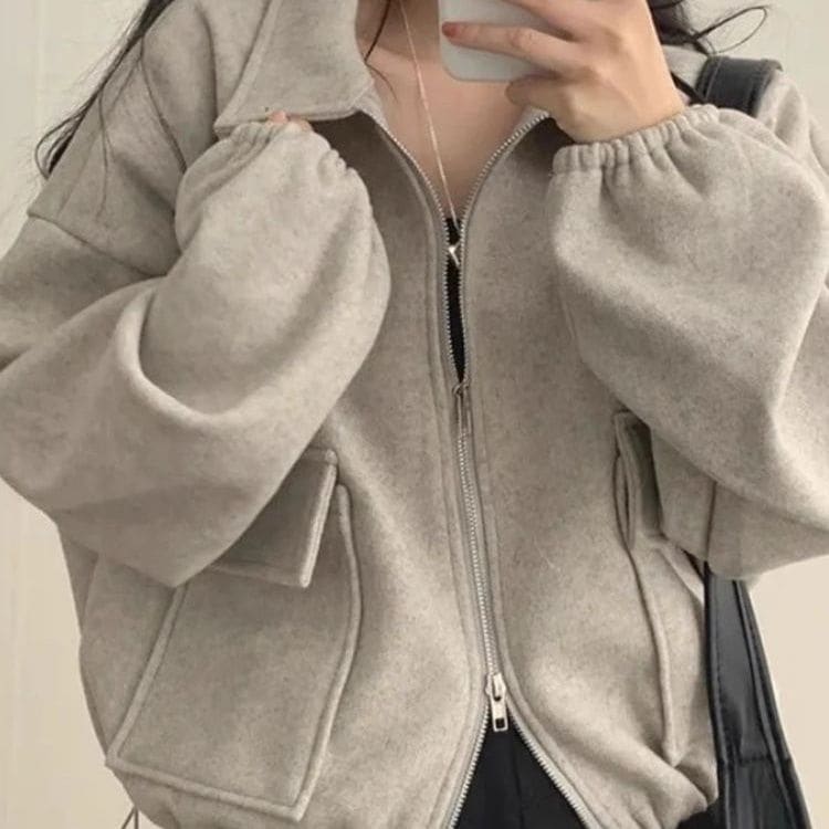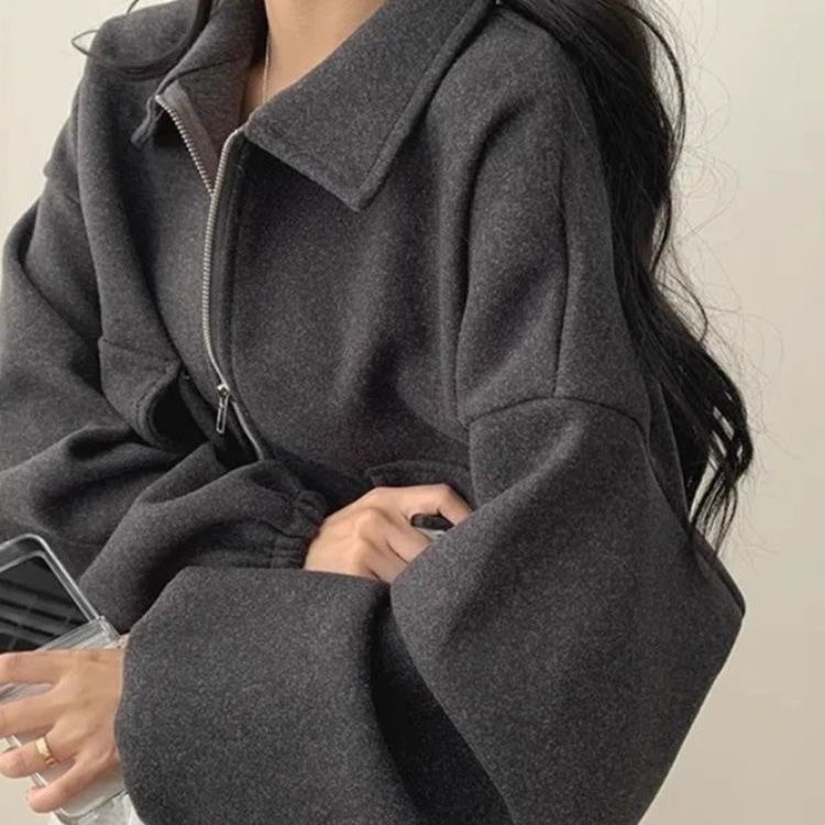 ジャンパー ブルゾン 韓国chic秋冬フレンチ減齢だるいダブルポケットファスナー襟抜きロープ収納ウエストショート丈コート女性痩せ見え ジャンパー ブルゾン