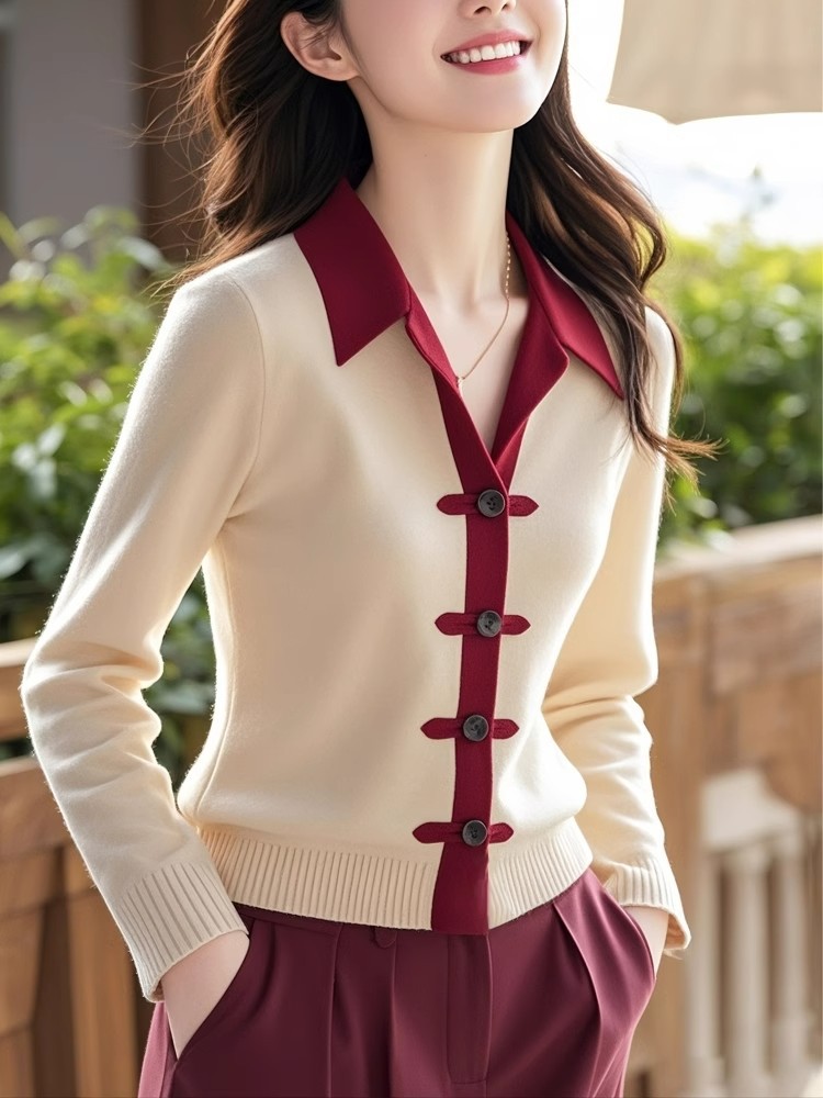 ニットカーディガンポロ襟衝突色のニットセーターの女性2025冬の新しい気質野生の頭の長袖ジャンパー小さなシャツ セーター ニット セーター