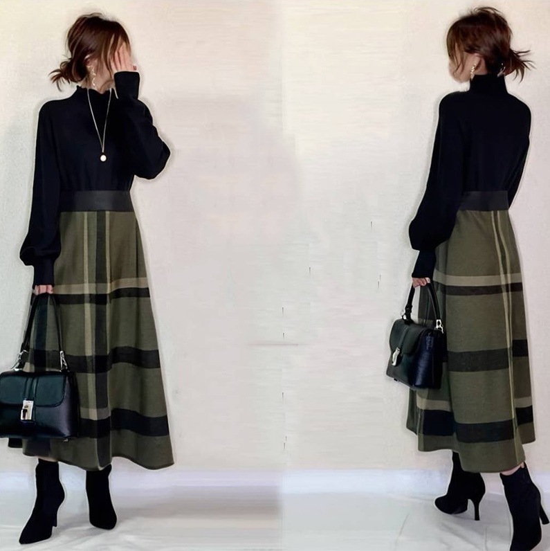 2025初春新品 日系 セーター ニットワンピース 切り替え ニット チェック 春 大きめサイズ ワンピース レディースファッション メガ割商品