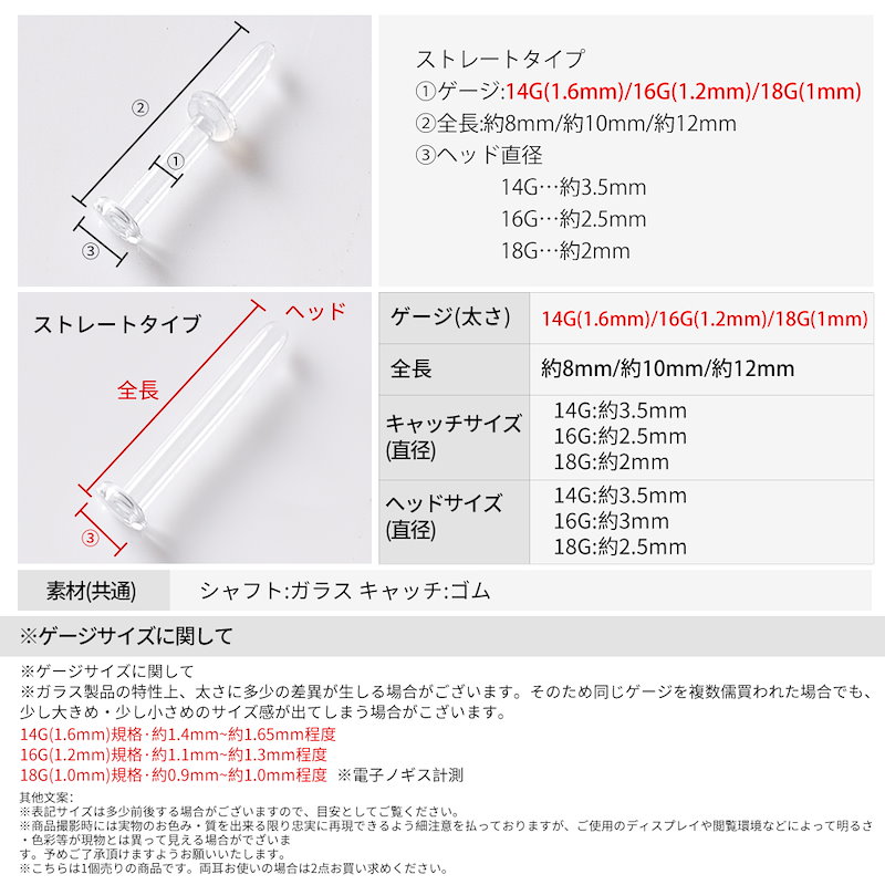 タイプXゲージ: 透明【ストレート】14G 透明【ストレート】16G 透明【ストレート】18G