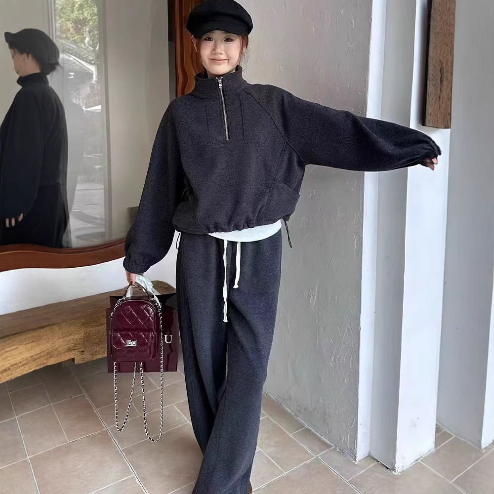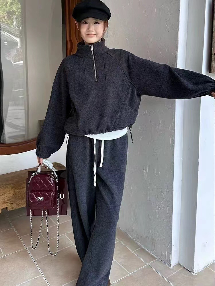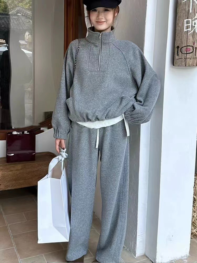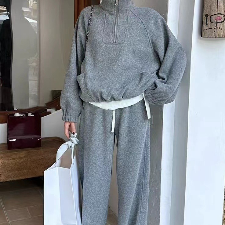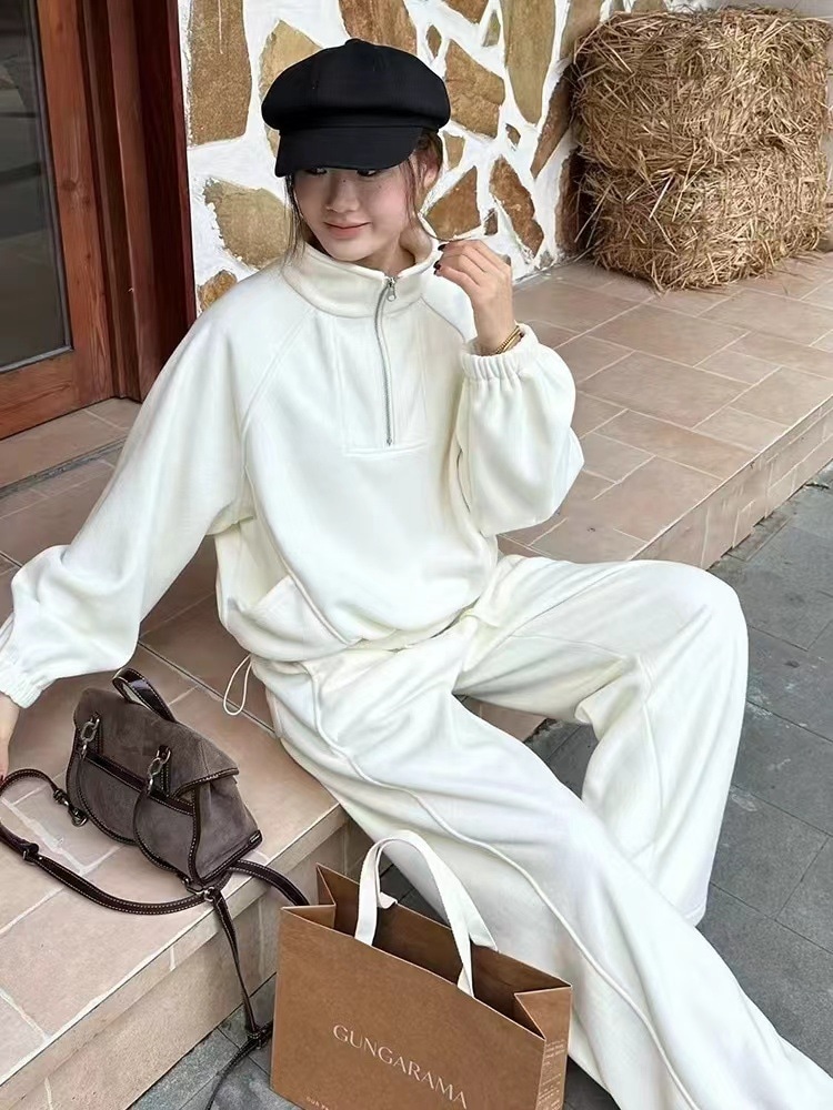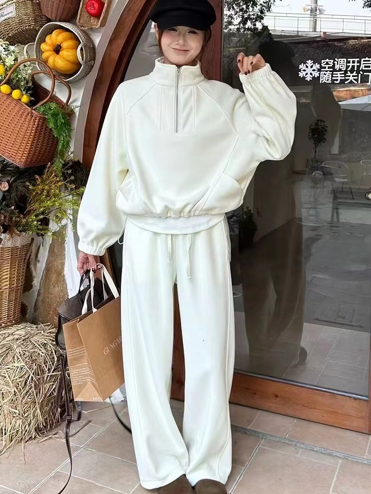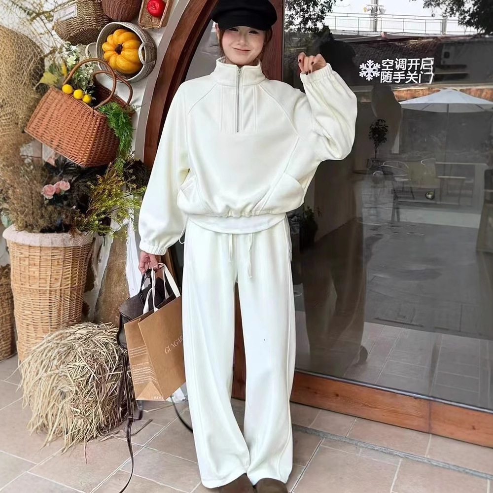 初春新作 上品セットアップ レディース 韓国ファッション 高級感カジュアルスウェット上下セット 無地シンプル ワイドパンツス+長袖スウェット二点セット 大きいサイズ体型カバー