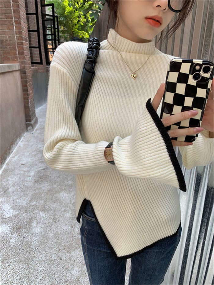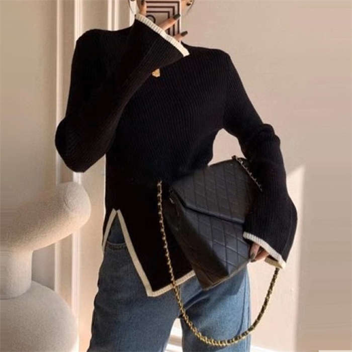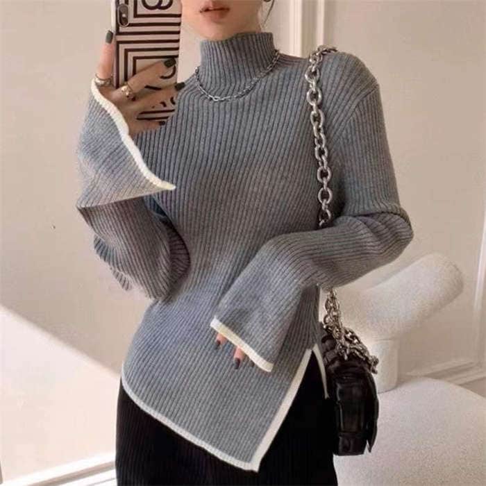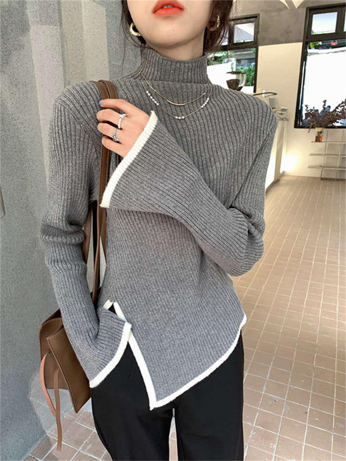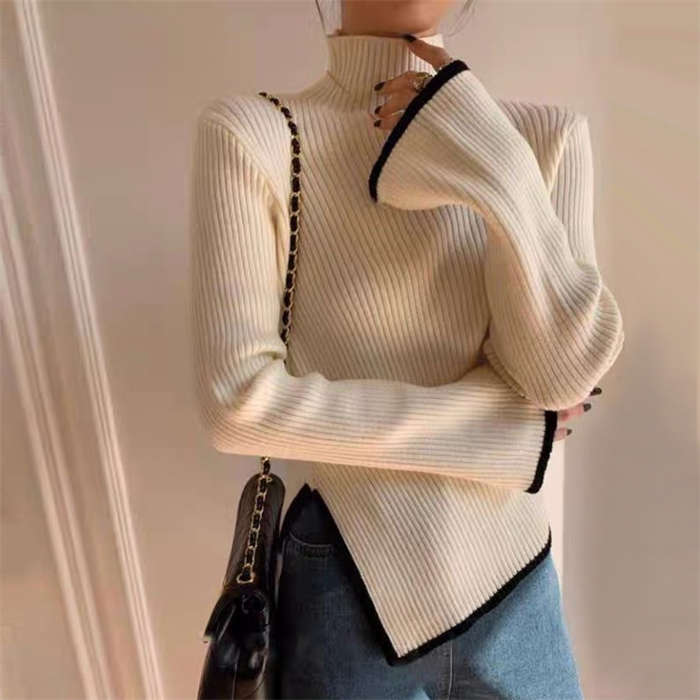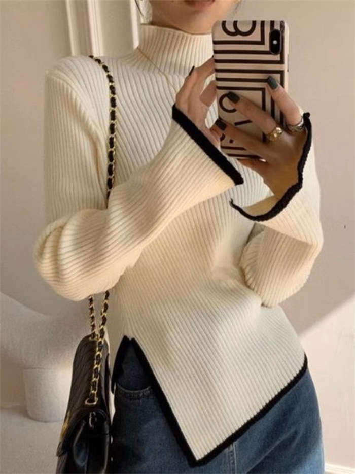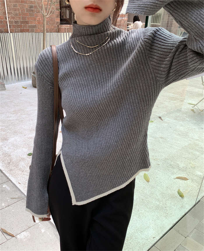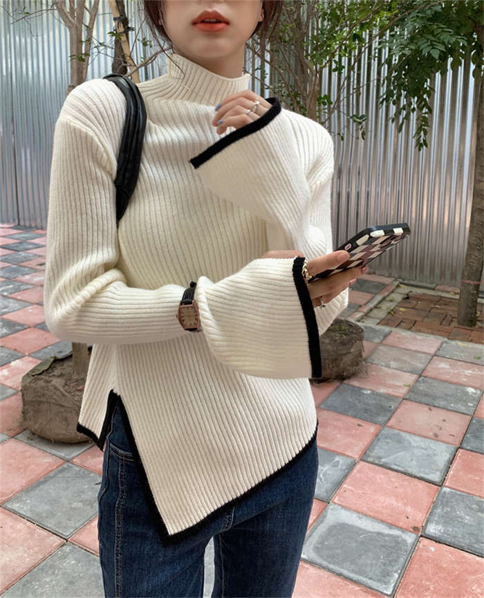 ニットセーター レディース ハイネック 長袖 無地 ニットウェア セーター トップス アシンメトリー カットソー きれいめ 配色 秋冬 リブニット プルオーバー 暖かい 防寒 カジュアル シンプル