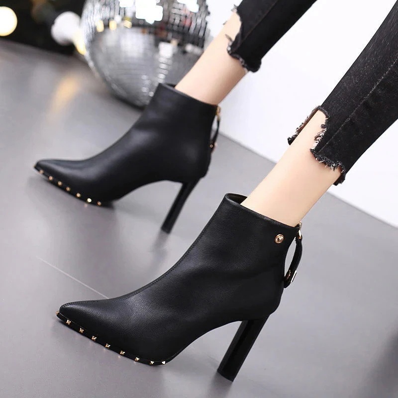 新作ポインテッドトゥ 秋冬 ハイヒール 通勤靴 韓国ファッション シューズ 太ヒール ショートブーツ レディースファッション ヒールブーツ ショート ミドルブーツ