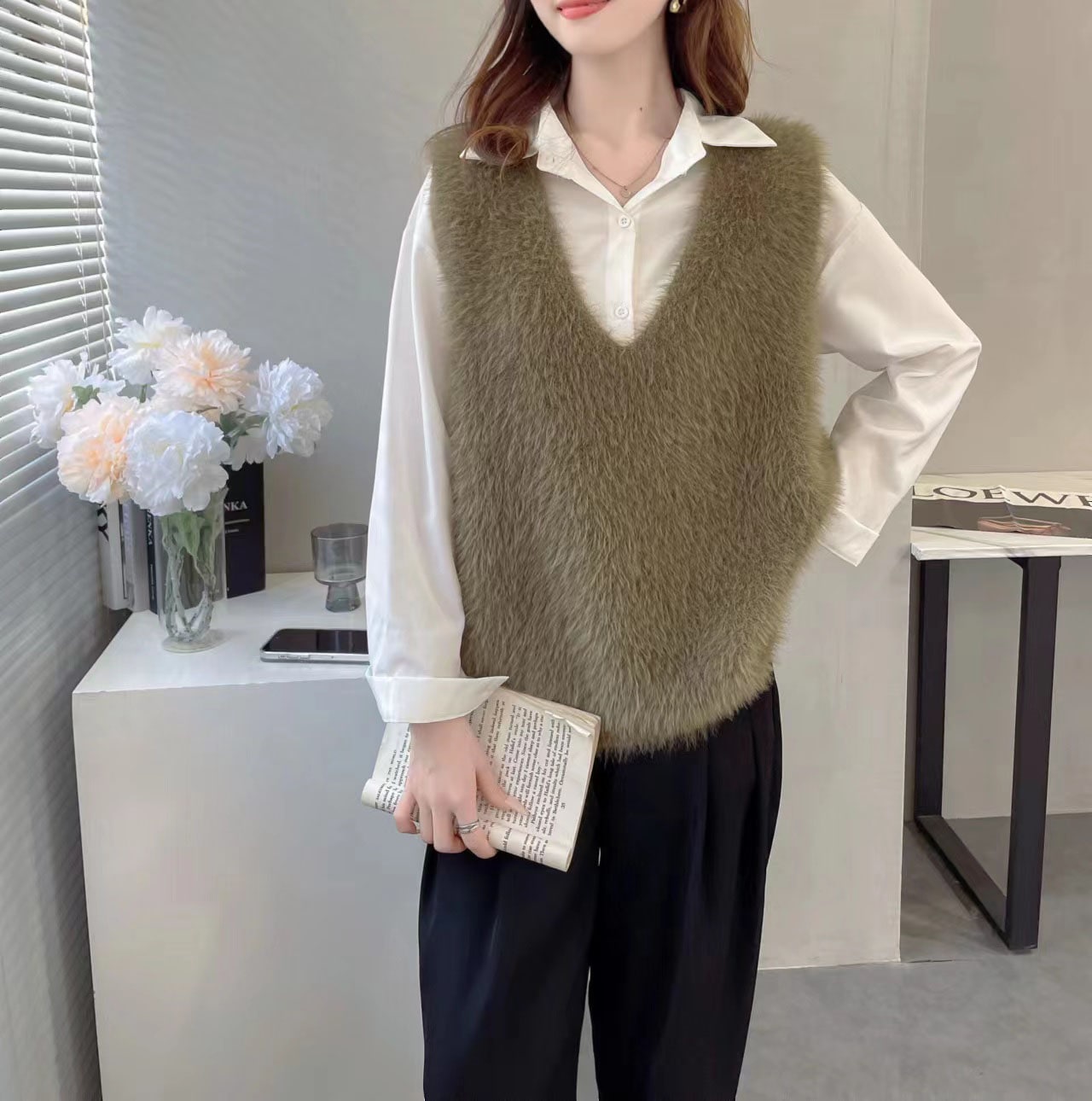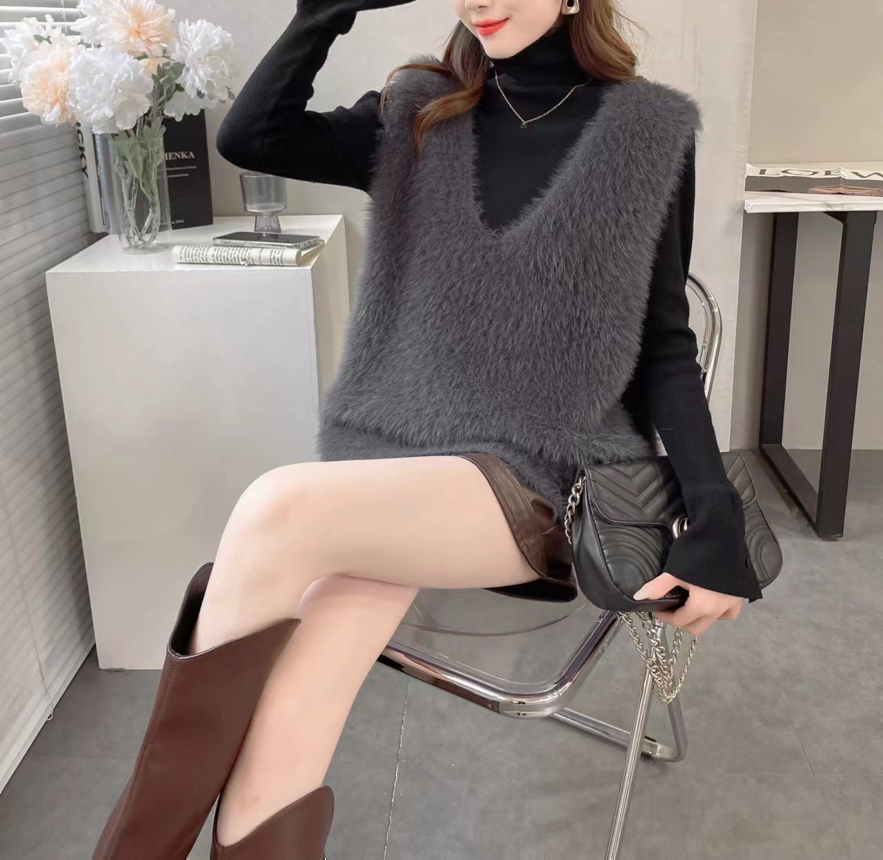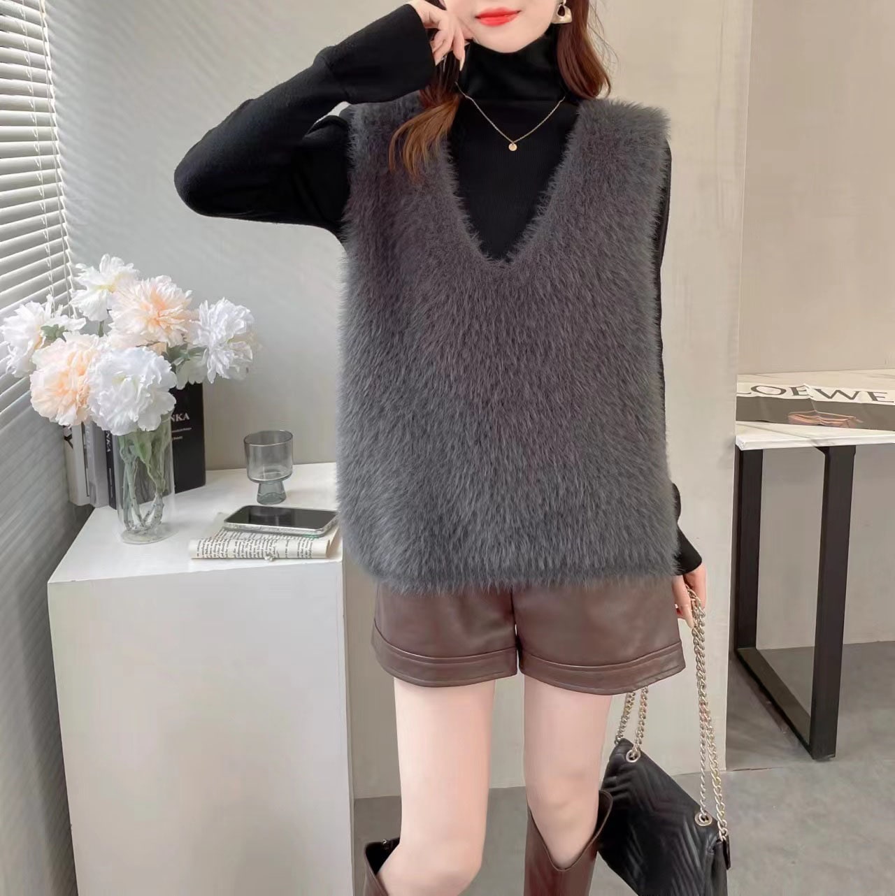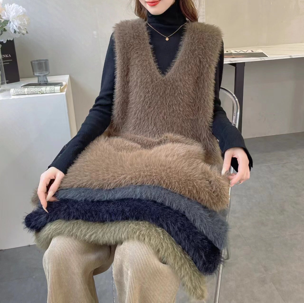 の新作シャギーニット モヘア ベスト トップス レディース シャギーベスト レイヤード Vネック 長毛 シャギー S-XL トレンド ニット