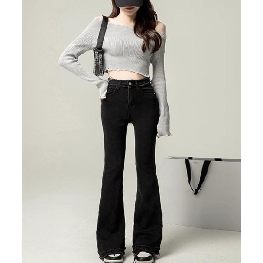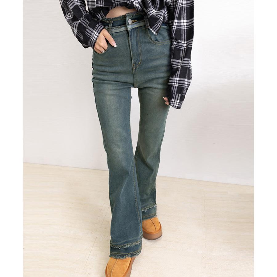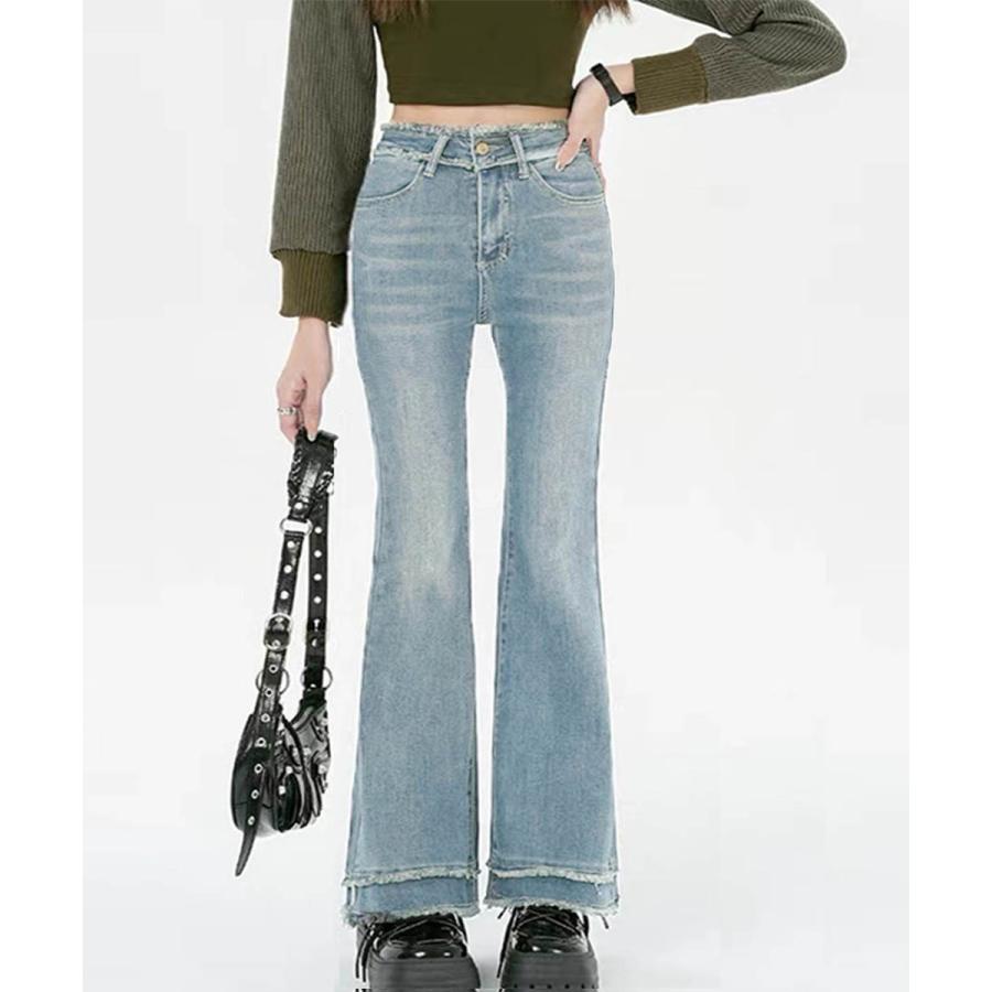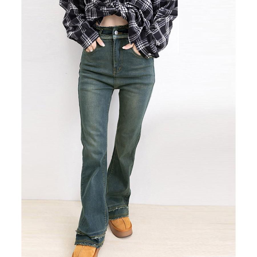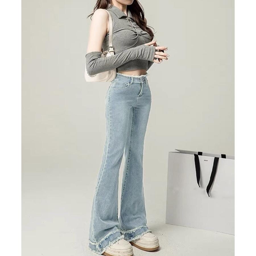 脚長効果 デニムパンツ フリンジ フレアパンツ ファッション デニム ジーンズ