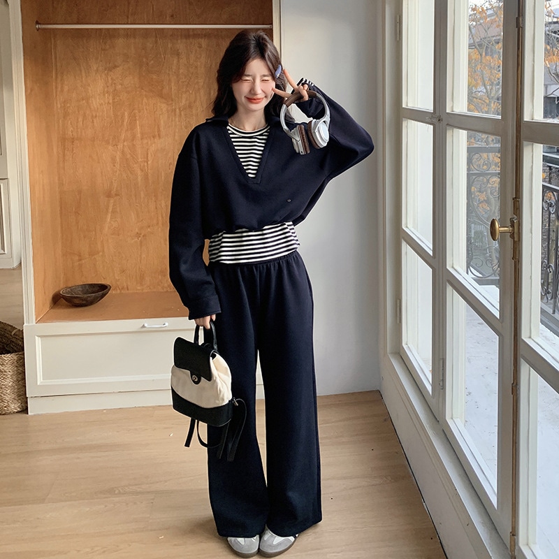 韓国のファッションストライプのスプライシング偽のツーピースセーターセット2025新しいカジュアルなズボンのツーピースセット セットアップ