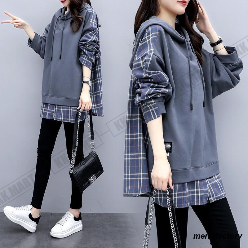 人気商品超目玉 パーカー レディース トップス スウェット 重ね着風 体型カバー チェック柄 レイヤード 羽織り フード付き トレーナー プルオーバー カジュアル