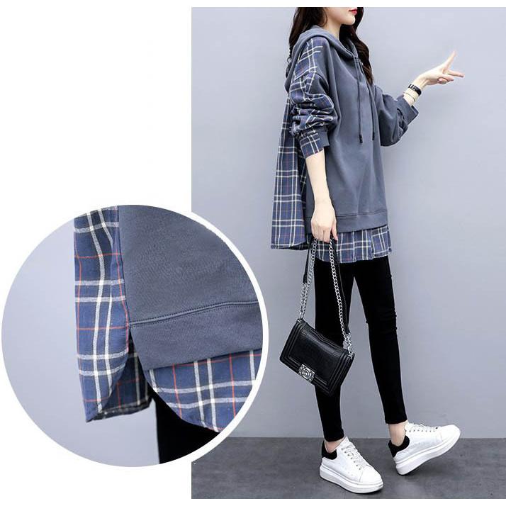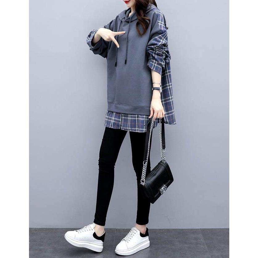 チェックシャツ 切り替え レイヤード風 フード付き レディース パーカー ドロップショルダー ゆったり トップス 大きいサイズ フリーサイズ 春秋 薄手