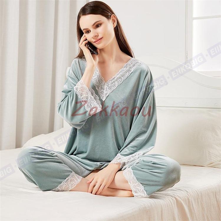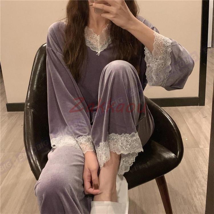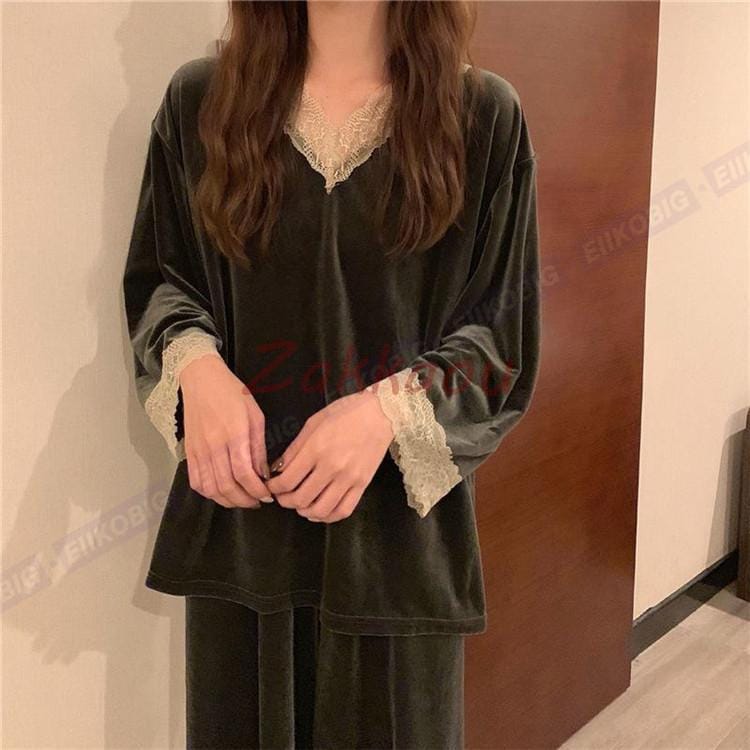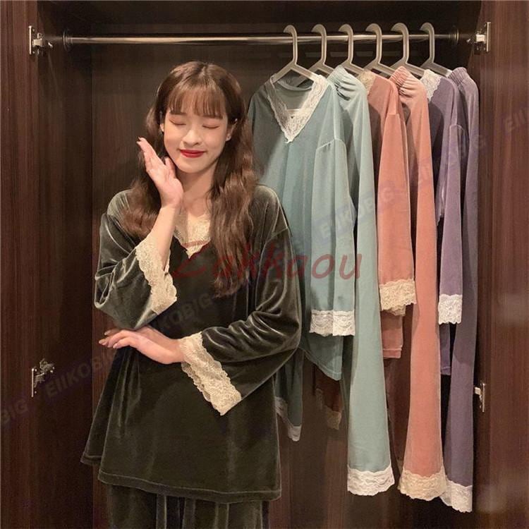 超目玉新品 パジャマ モコモコルームウェア レディース 春秋長袖 パジャマ レース Vネック ルームウェア ベルベット 暖かい 上下セット 可愛い 部屋着