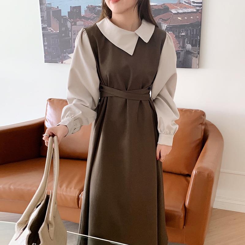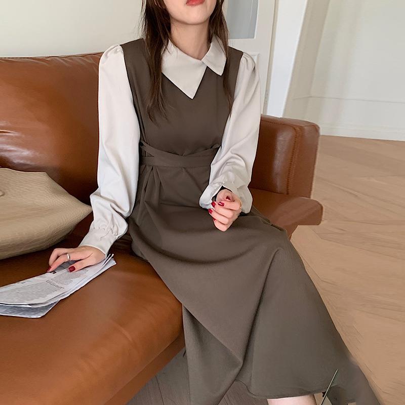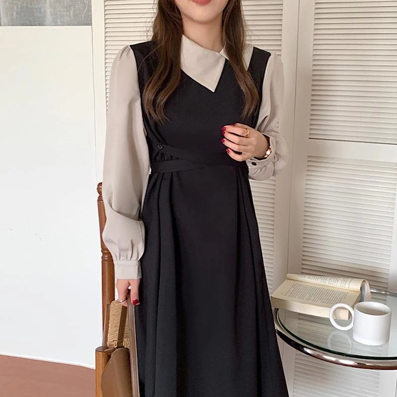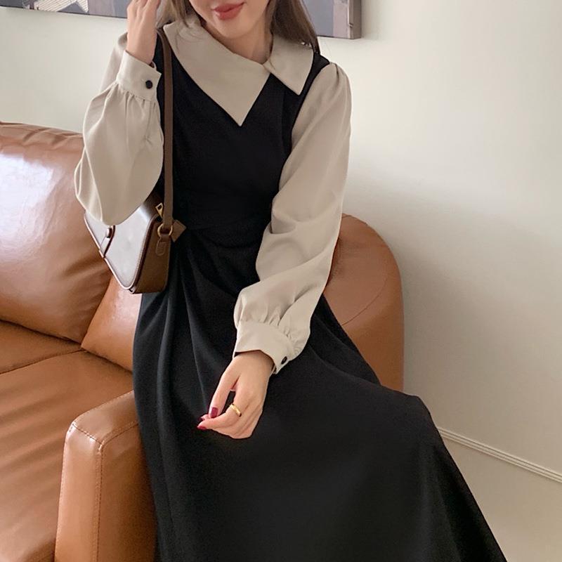 韓国chicフレンチレトロ 開襟 ドレス ワンピース 上品 通勤 OL レディース フレンチ ワンピース 体型カバー 長袖ロング マキシ丈ワンピ