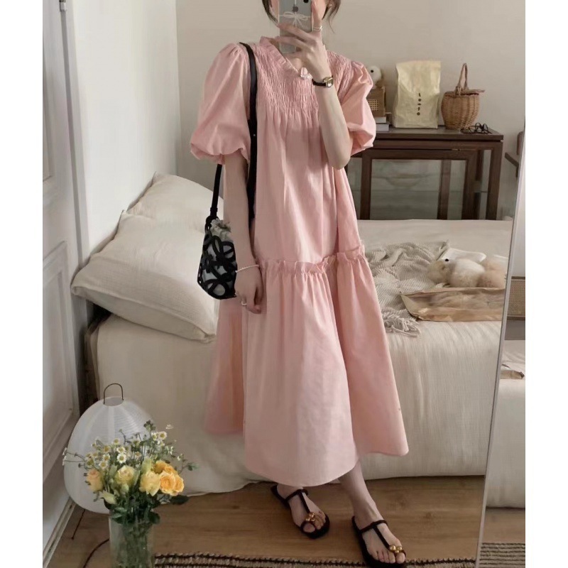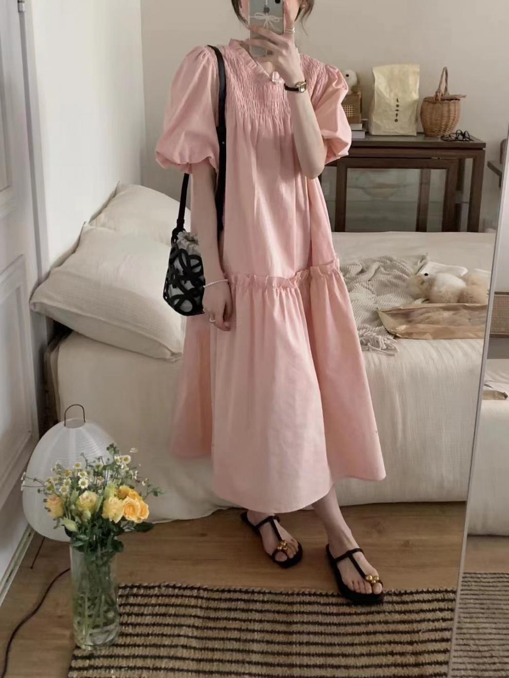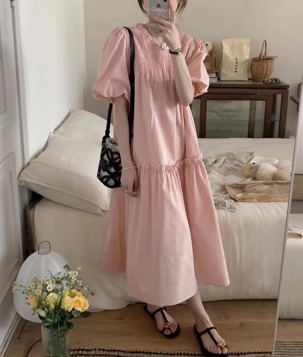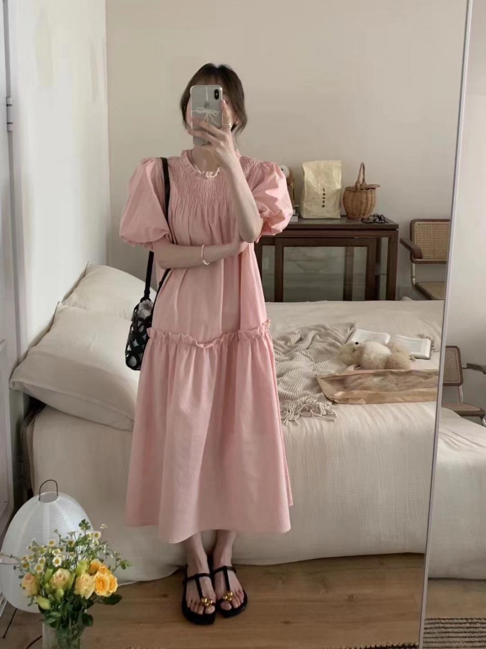 パフスリーブ ワンピース レディース 韓国 大人可愛い 夏ワンピ ピンク シンプル 半袖 おしゃれ かわいい リゾート 二次会 入学式 ワンピース きれいめ