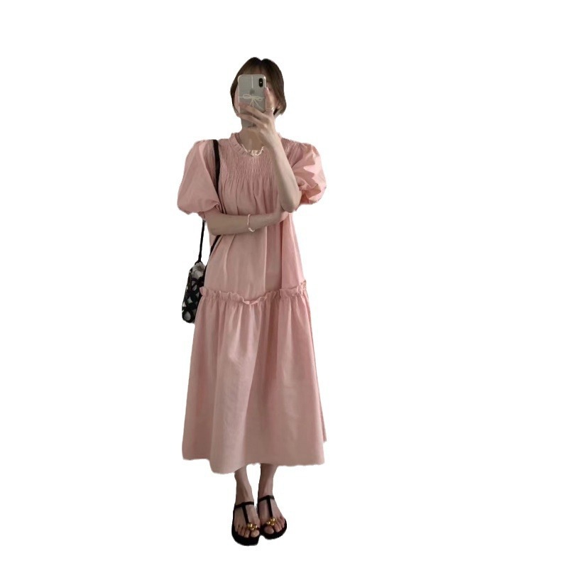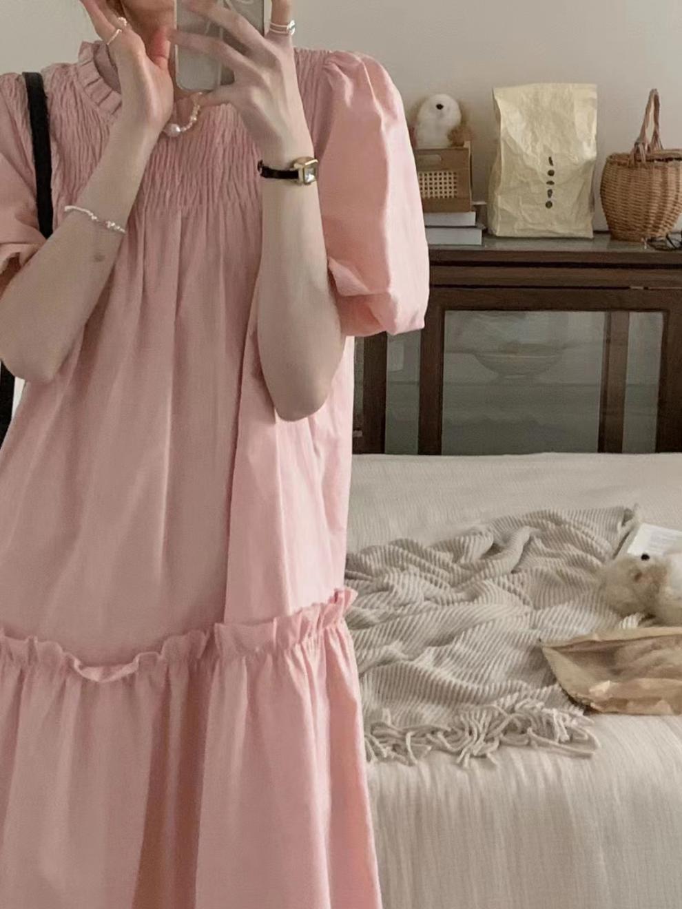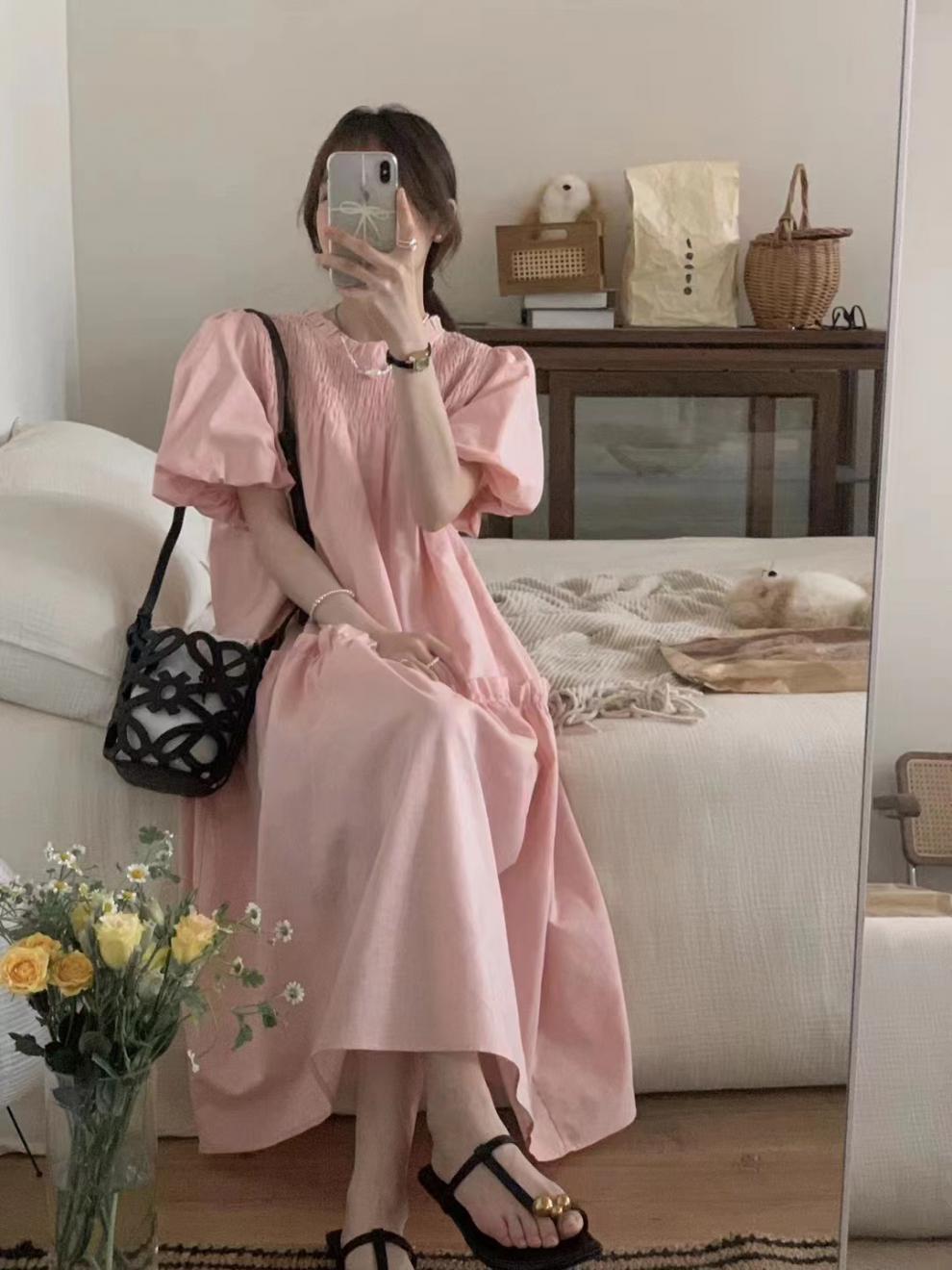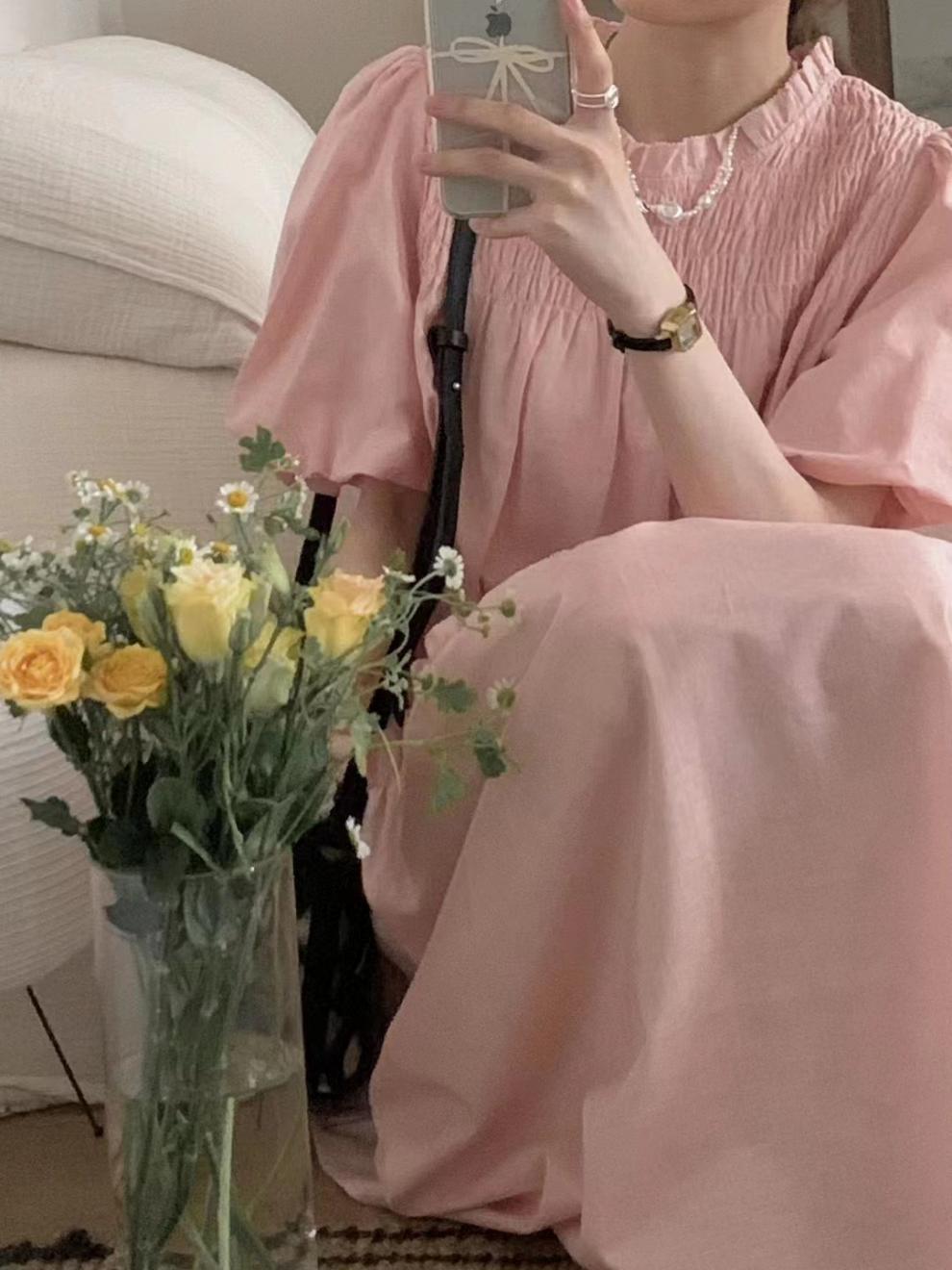 パフスリーブ ワンピース レディース 韓国 大人可愛い 夏ワンピ ピンク シンプル 半袖 おしゃれ かわいい リゾート 二次会 入学式 ワンピース きれいめ