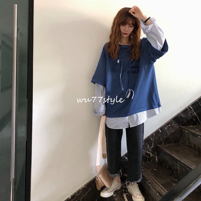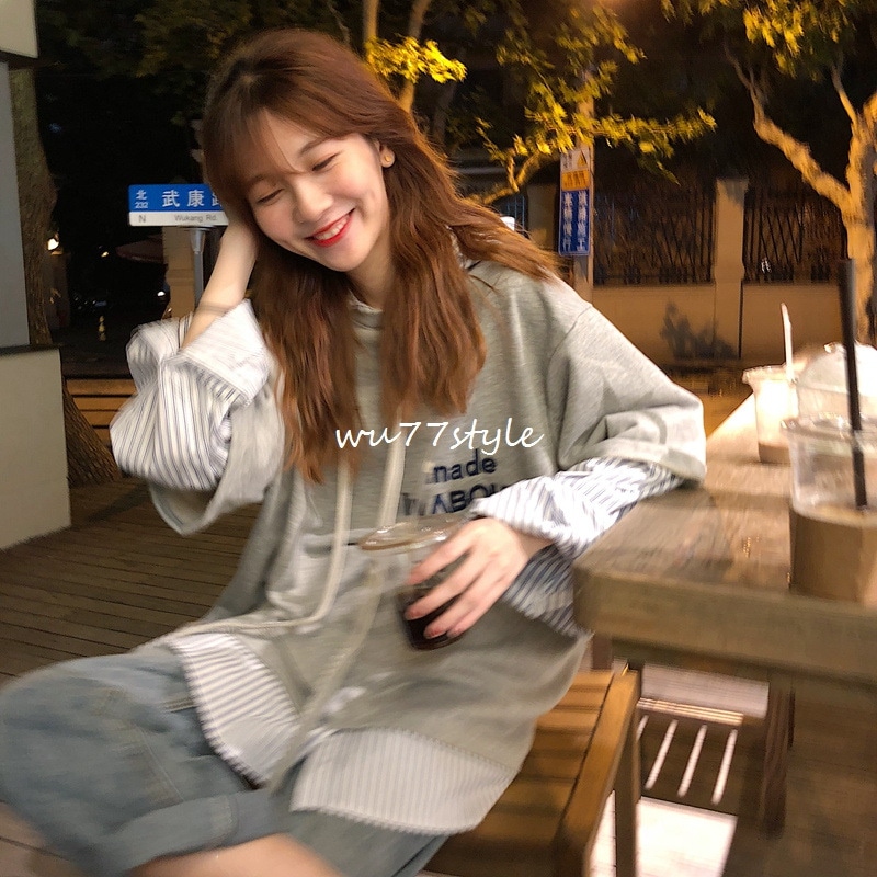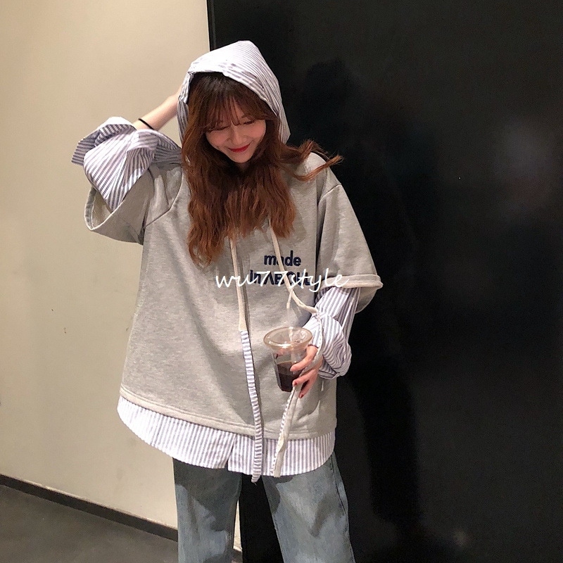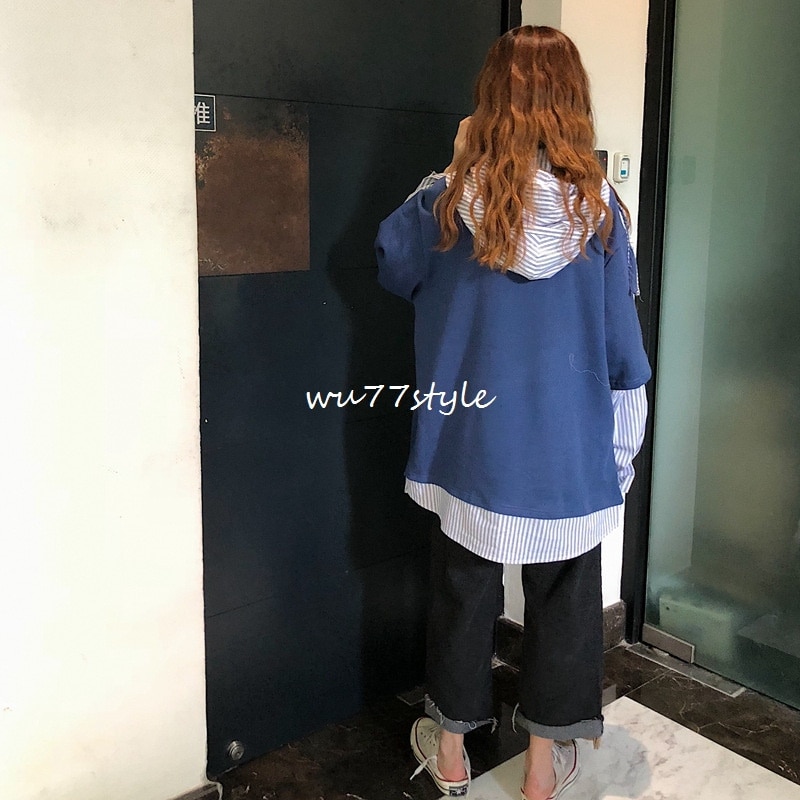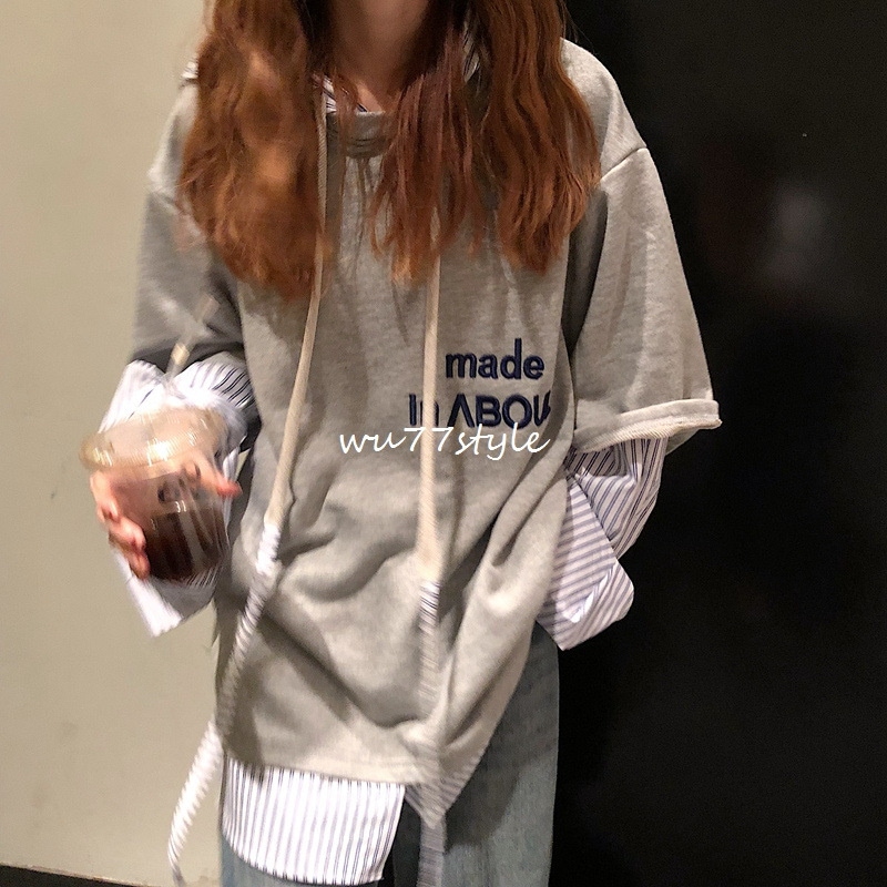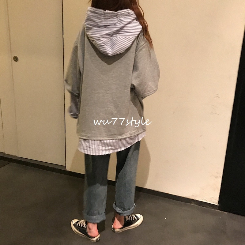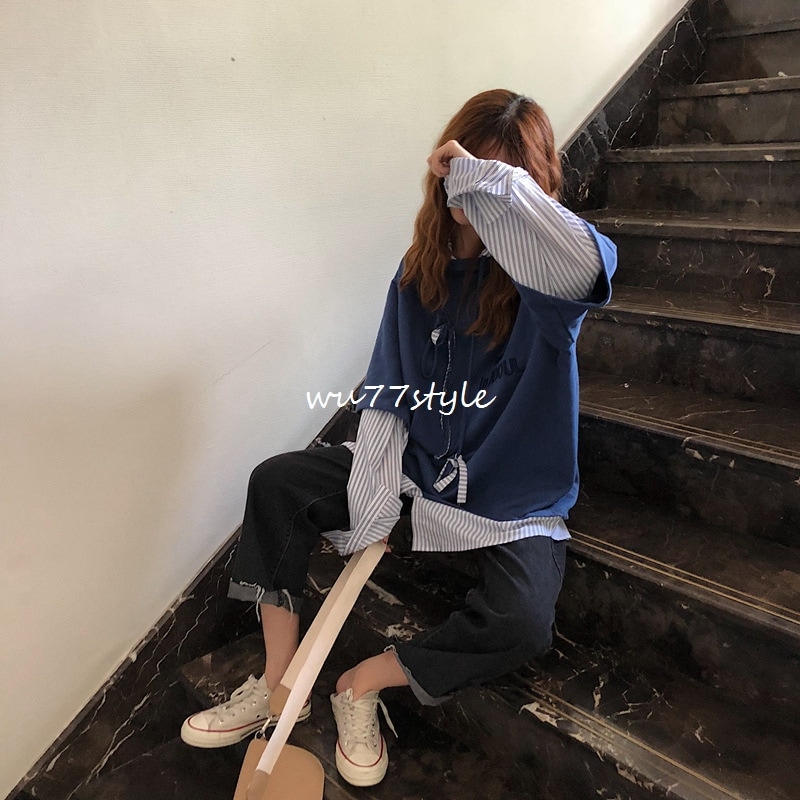 トップス プルオーバーパーカー スポーツ可爱パーカー二枚セット風秋アウターニットベスト フード付き 長袖ブラウス韓国 長袖パーカー