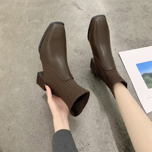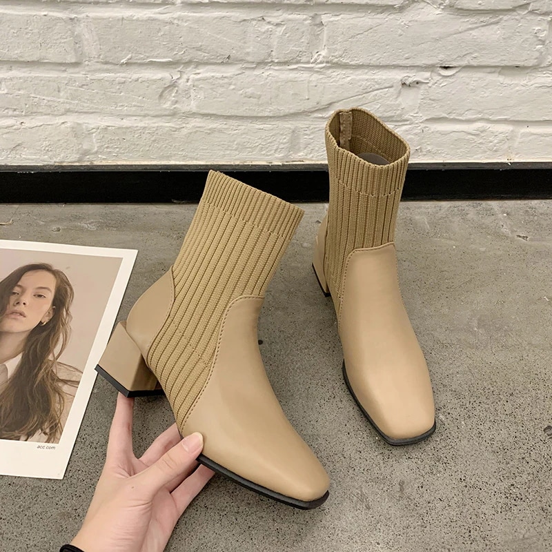 ブーティー 大きいサイズブーツ秋冬新作チャンキーヒールスクエアヘッドショートブーツ女性ニットアプリコットスキニーソックスブーツストレッチブーツ