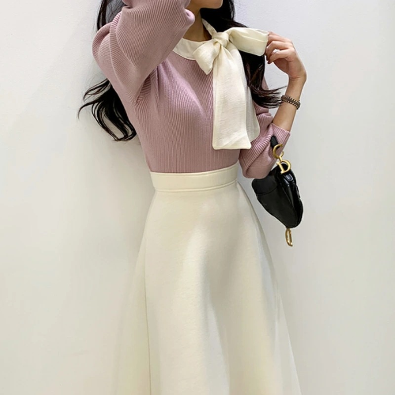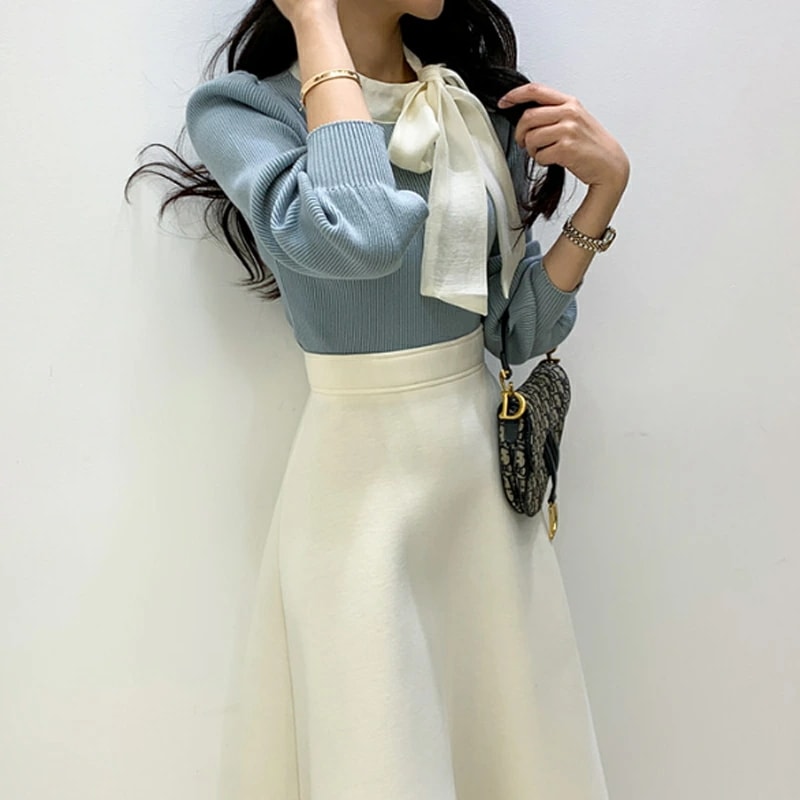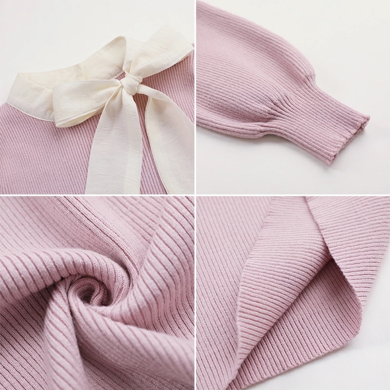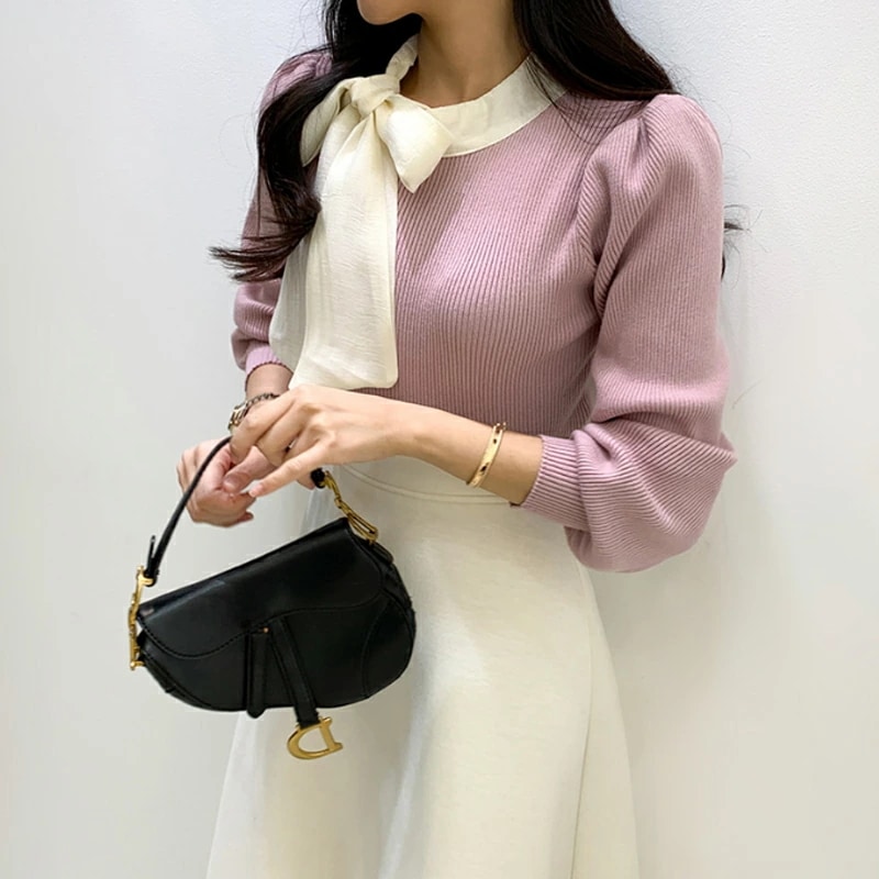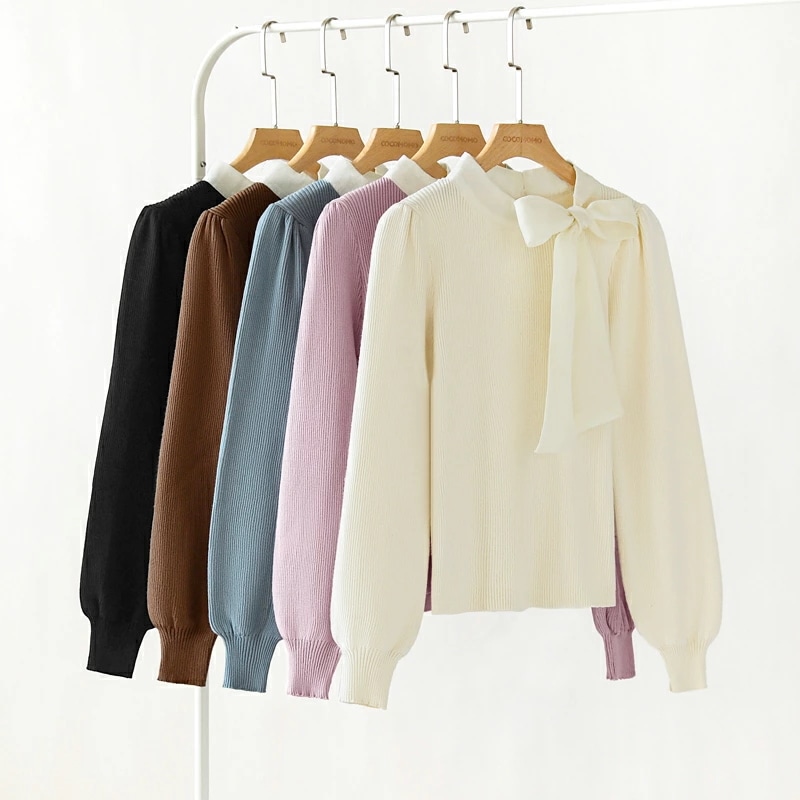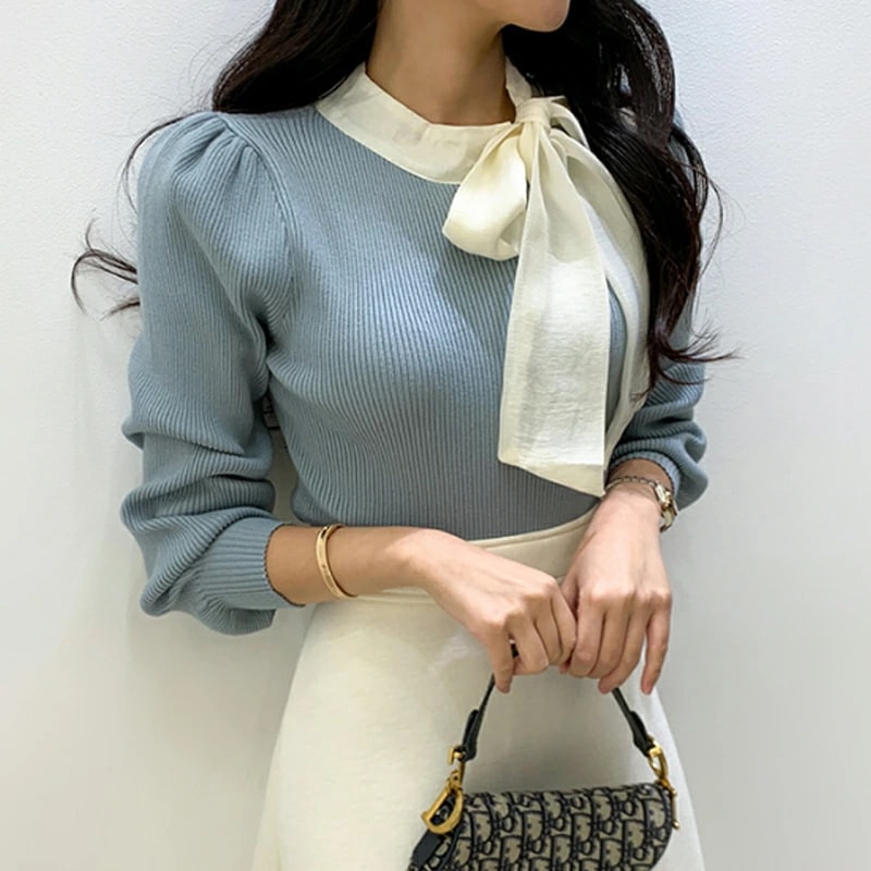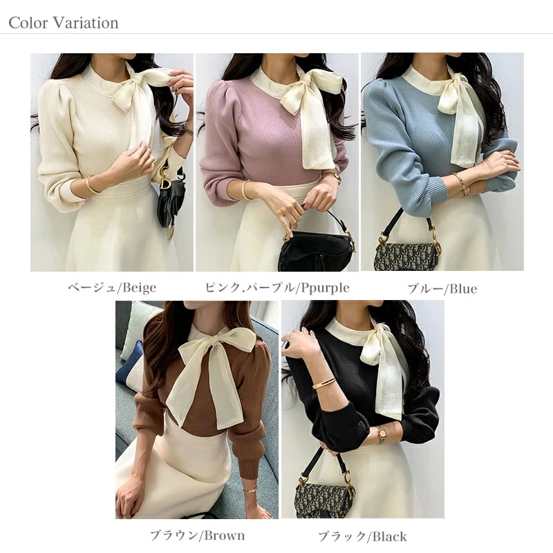 パフスリーブニット リボンタイ リブニット ニット パフスリーブ 長袖 レディース リボン ボウタイ トップス ボリューム袖 パワショル きれいめ ハイネック バイカラー