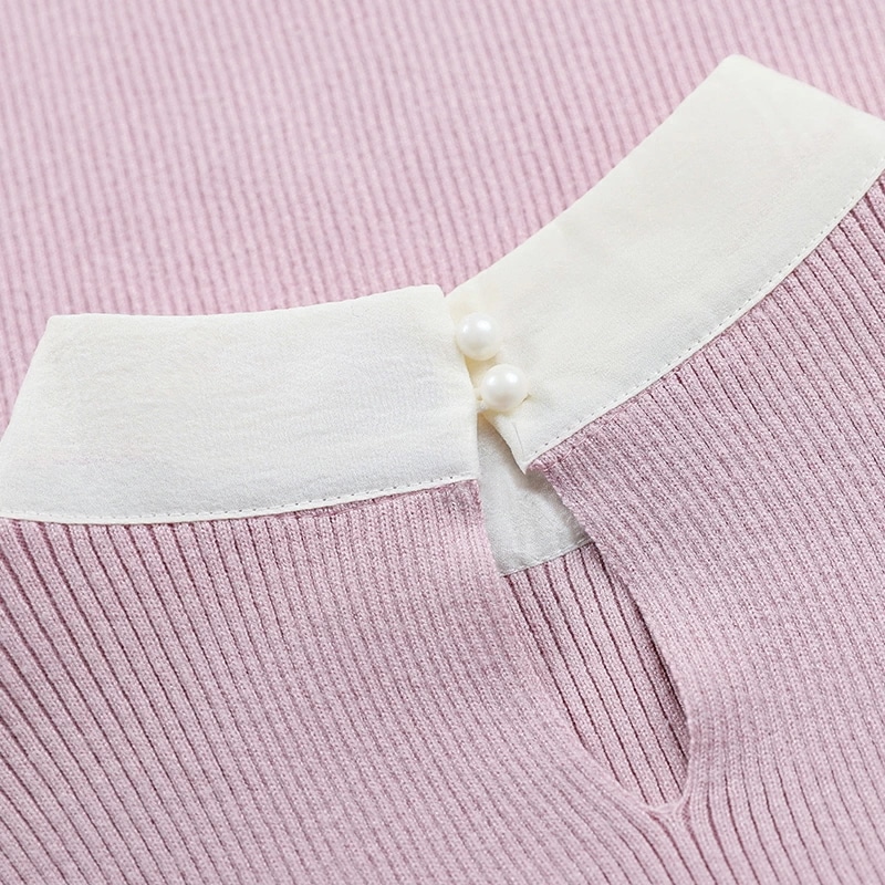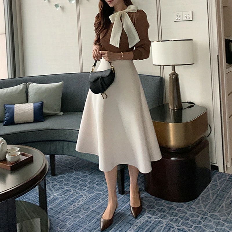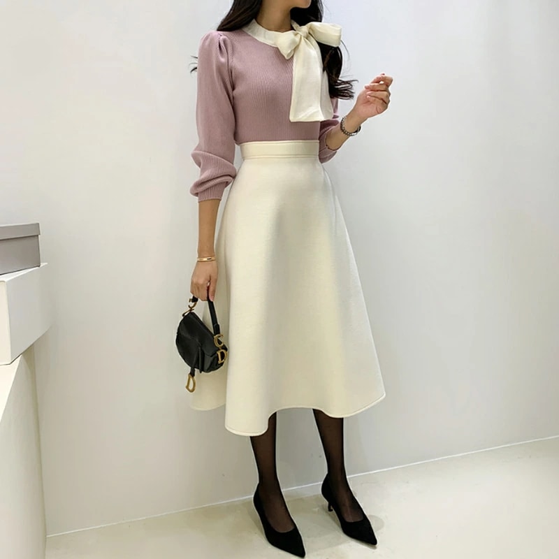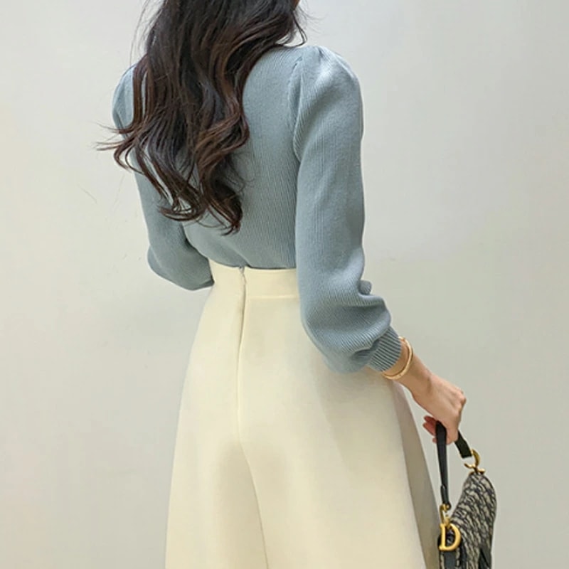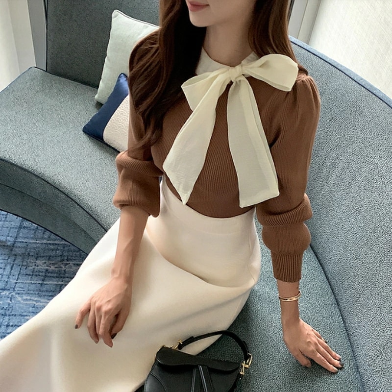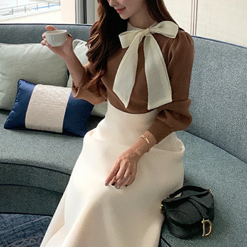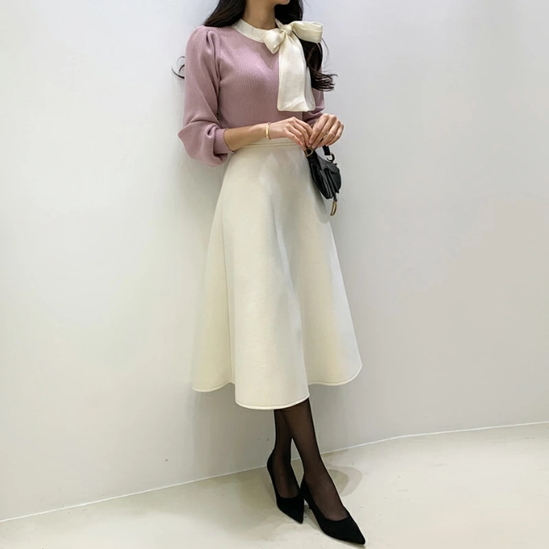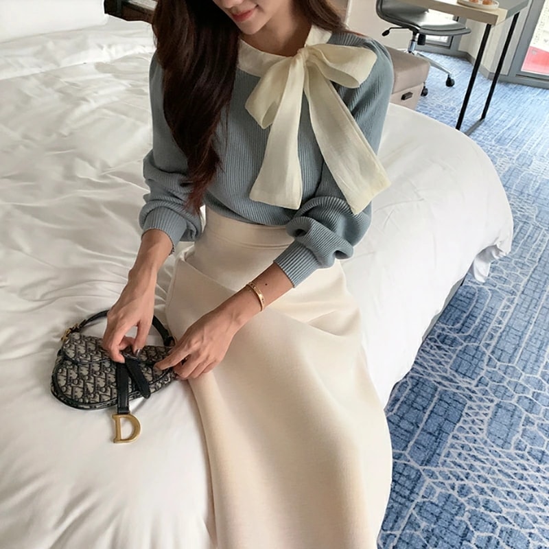 パフスリーブニット リボンタイ リブニット ニット パフスリーブ 長袖 レディース リボン ボウタイ トップス ボリューム袖 パワショル きれいめ ハイネック バイカラー