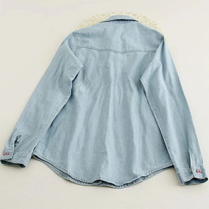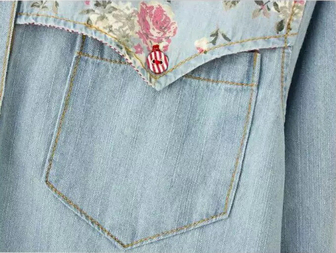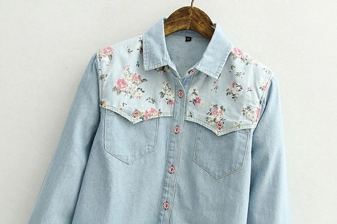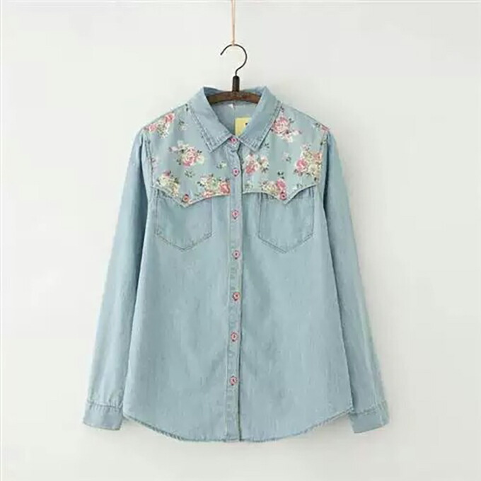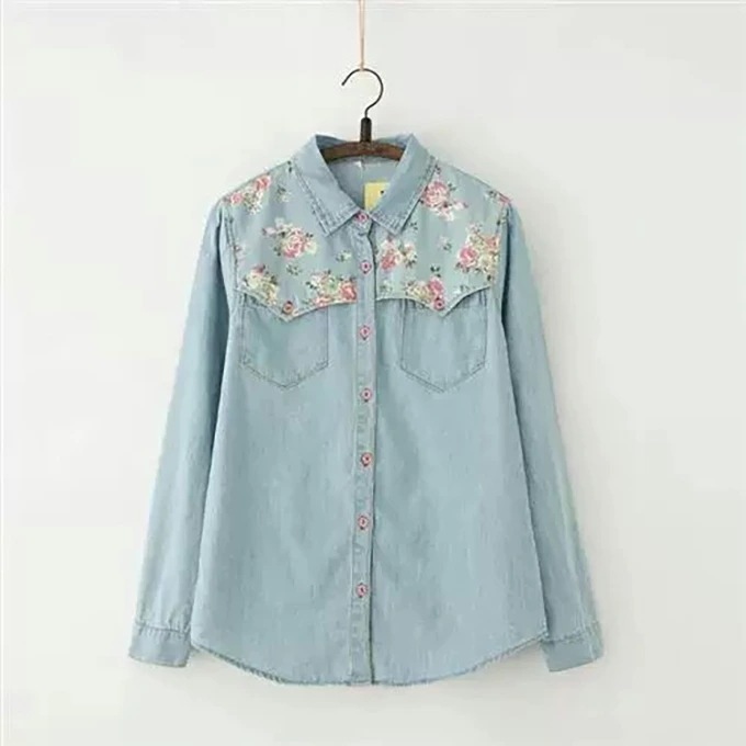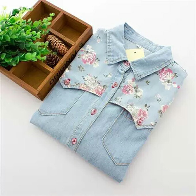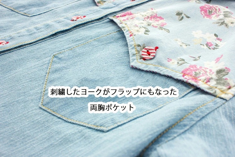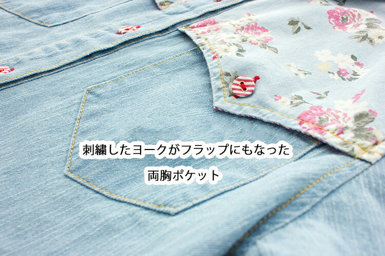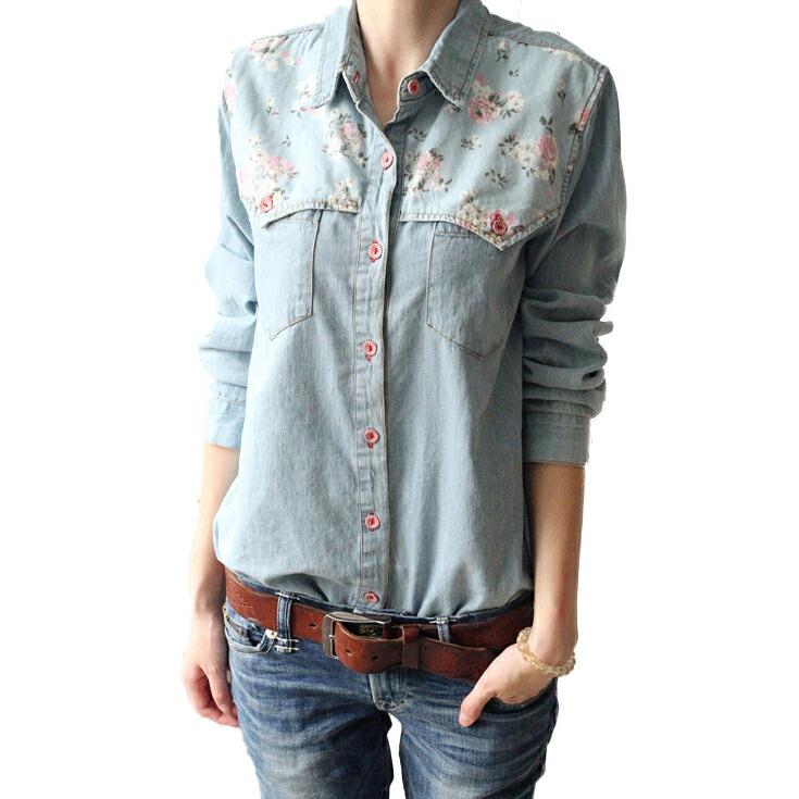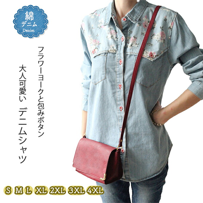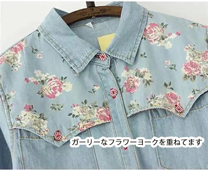 デニムシャツ 花柄 ウエスタンシャツ レディース フラワー 包みボタン オシャレボタン 大きめサイズ S M L XL 2XL 3XL 4XL ダンガリーシャツ プリント サックス