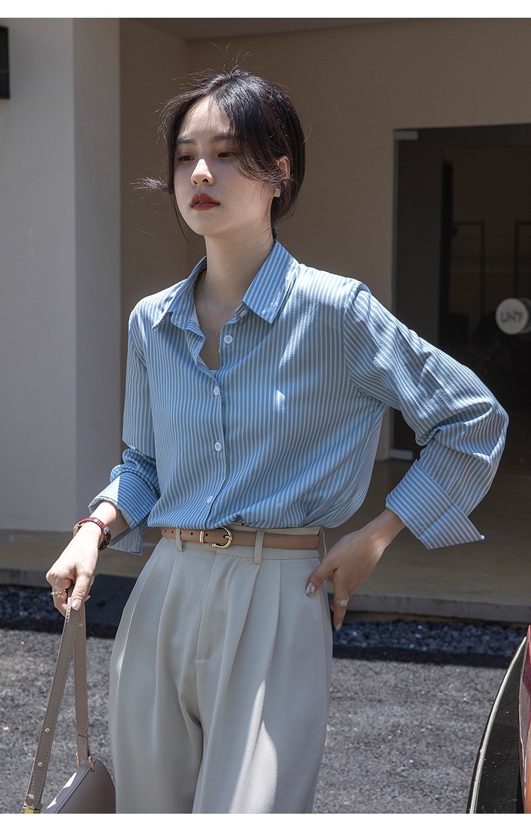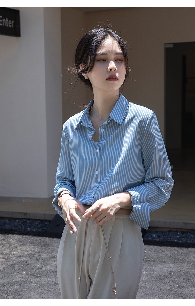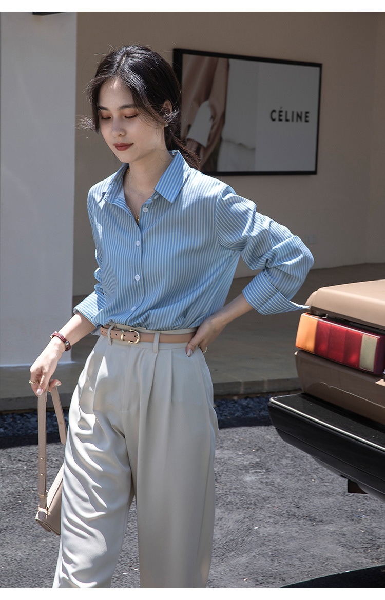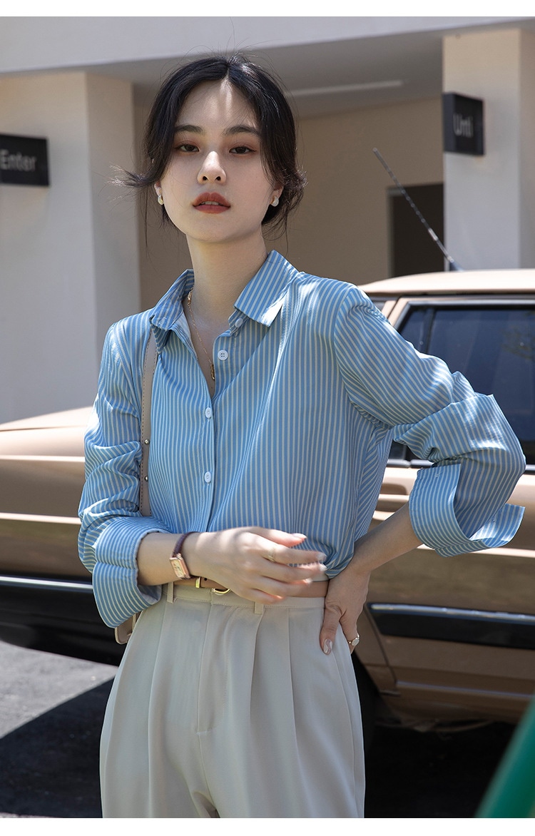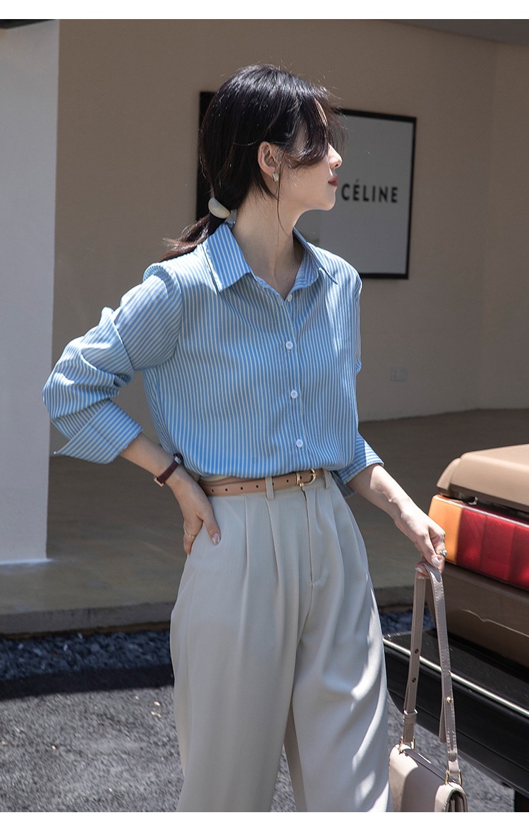 デザイン感の青いストライプのシャツの女性は春と秋の新しい青い白い長袖の上着を重ねて着ます シャツ ブラウス