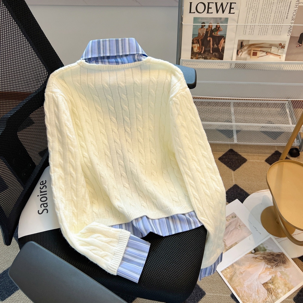 新しい偽の2つのストライプのシャツはセーターの女性の秋冬のデザイン感の小さい背のニットのコートをつなぎ合わせます シャツ ブラウス