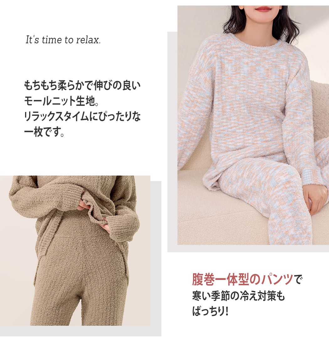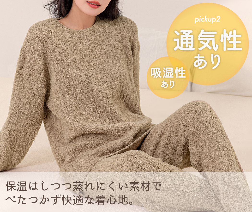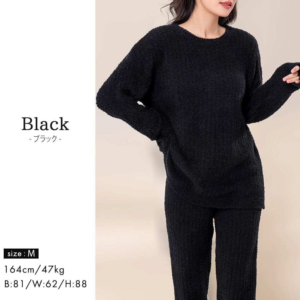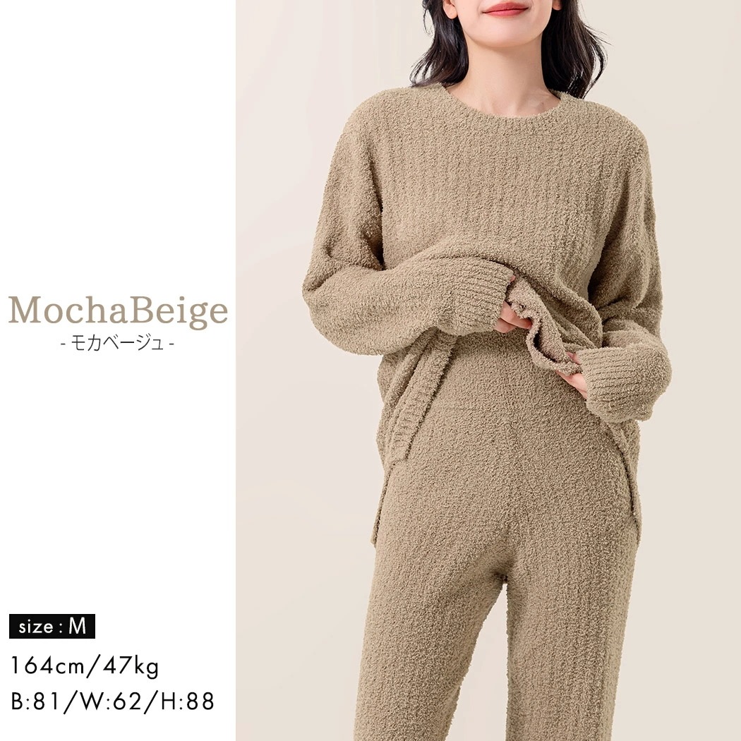 ,ルームウェア レディース 長袖 上下セット モールニット 起毛 パジャマ 寝巻き 部屋着 セットアップ プルオーバー トップス パンツ 腹巻き 一体型 ストレッチ 保温 吸湿性 静電気防止 通気性