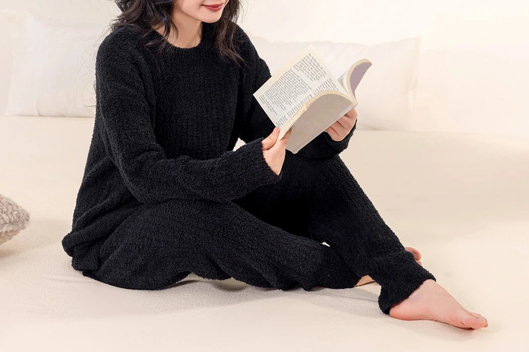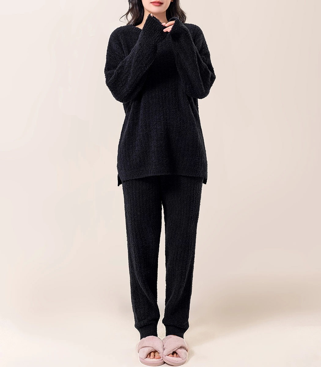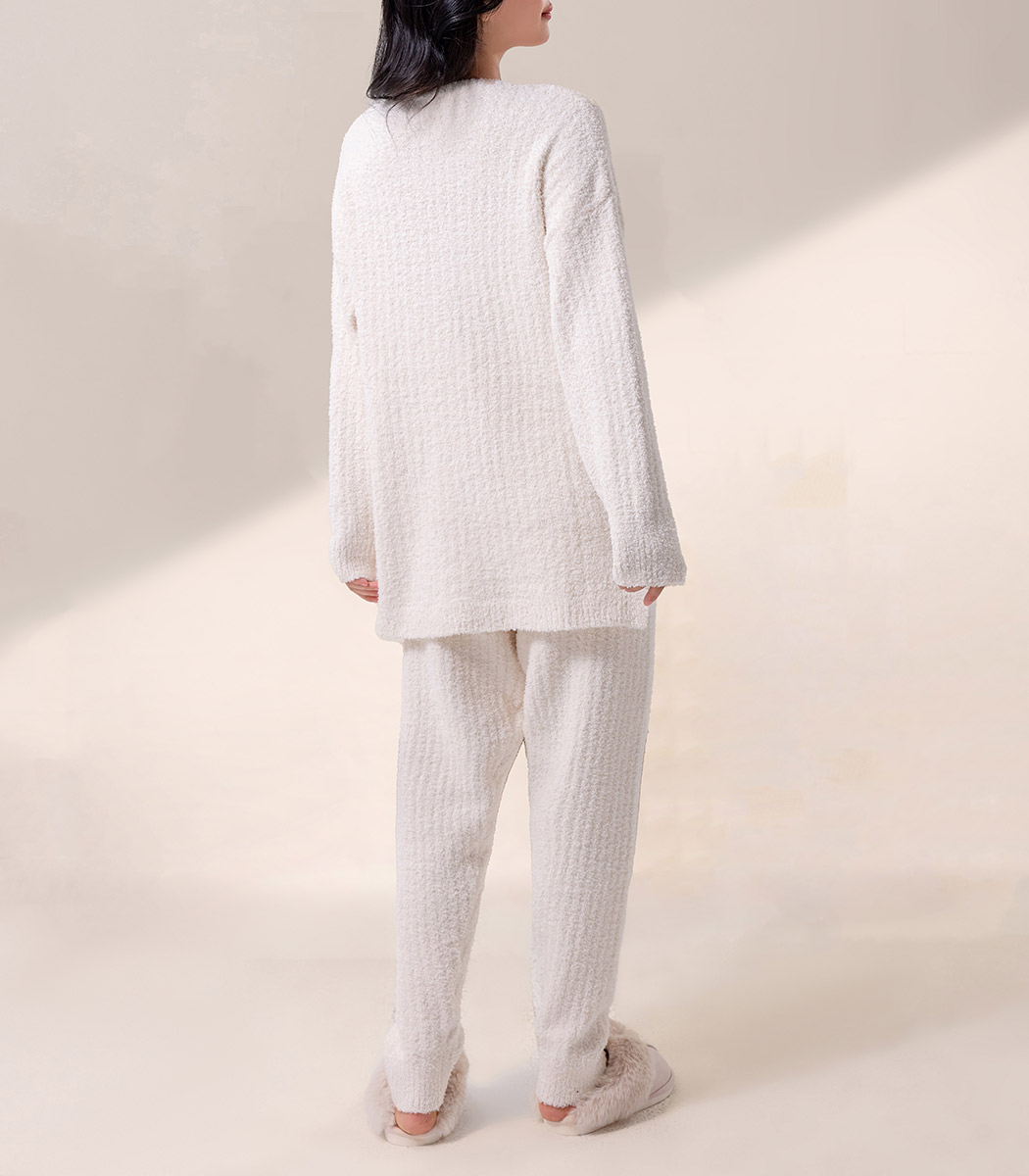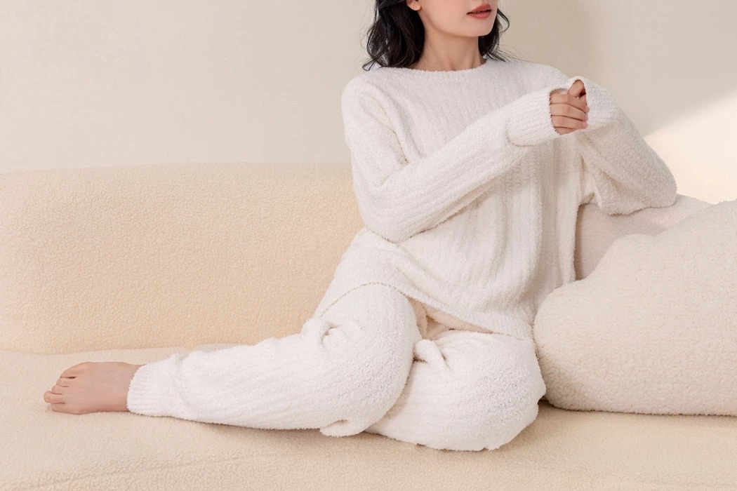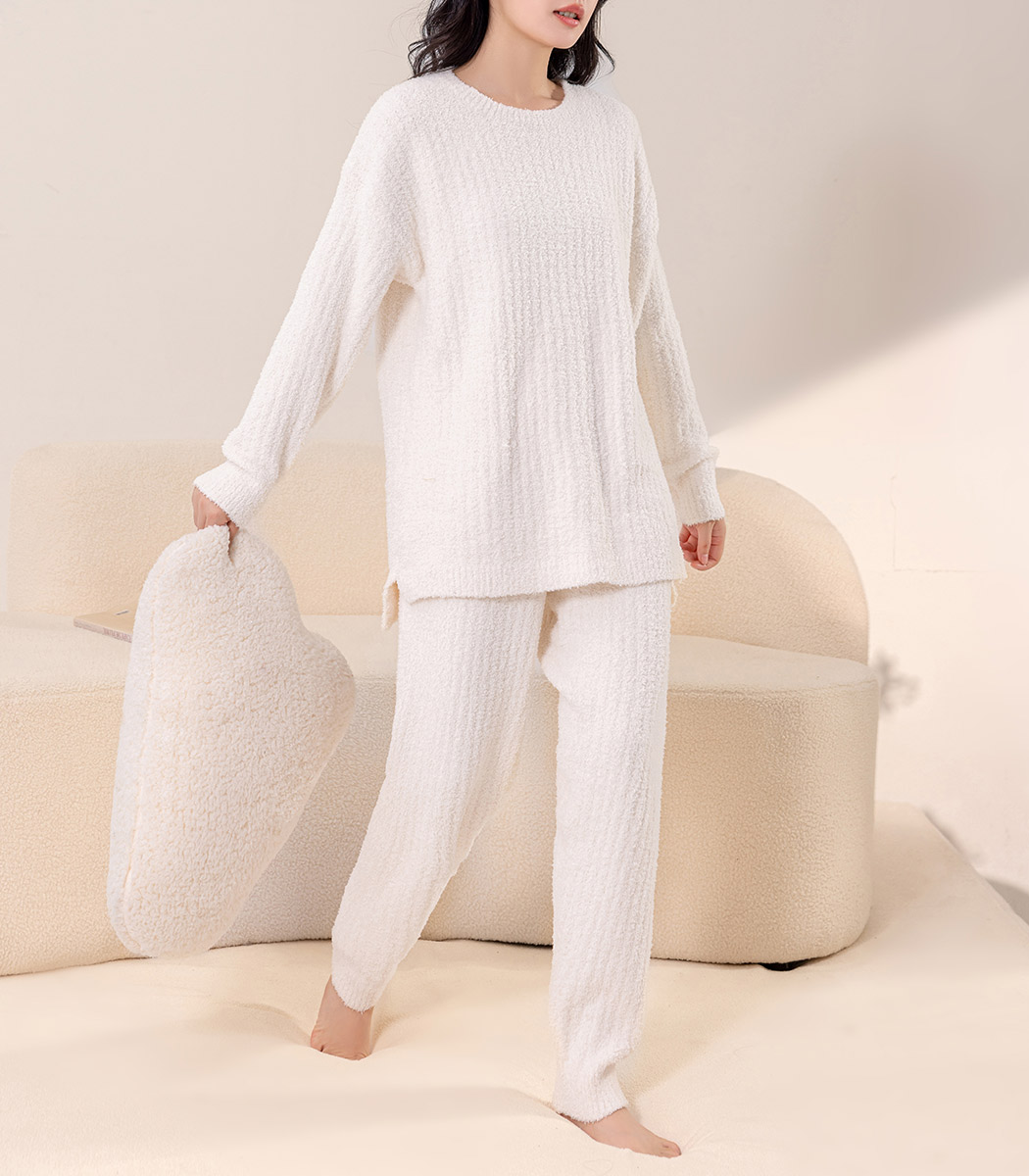 ,ルームウェア レディース 長袖 上下セット モールニット 起毛 パジャマ 寝巻き 部屋着 セットアップ プルオーバー トップス パンツ 腹巻き 一体型 ストレッチ 保温 吸湿性 静電気防止 通気性