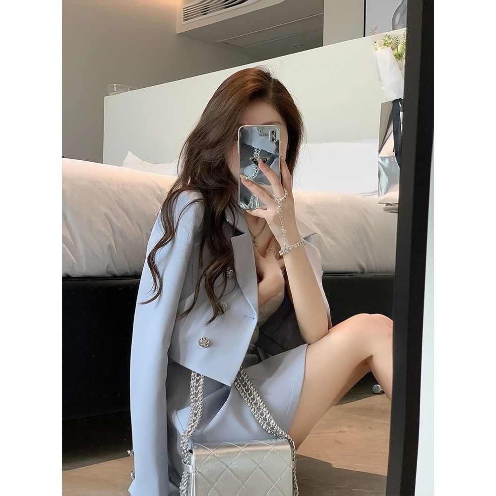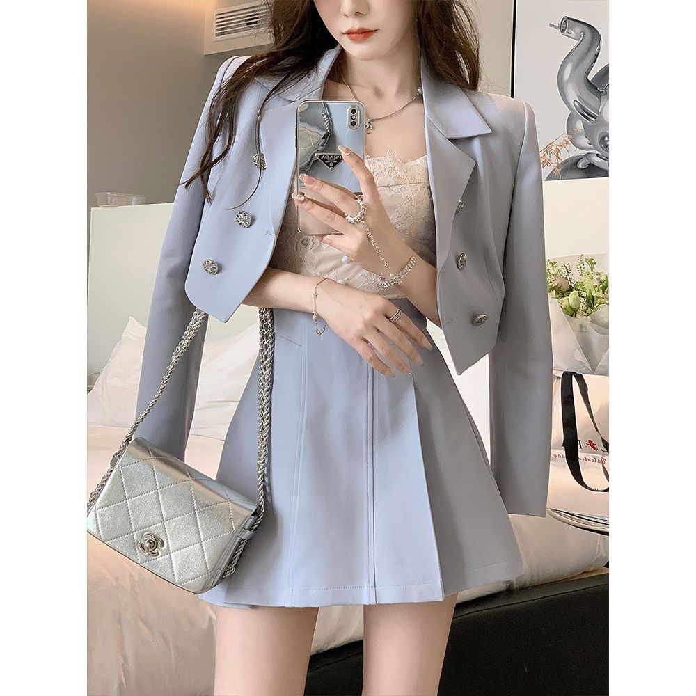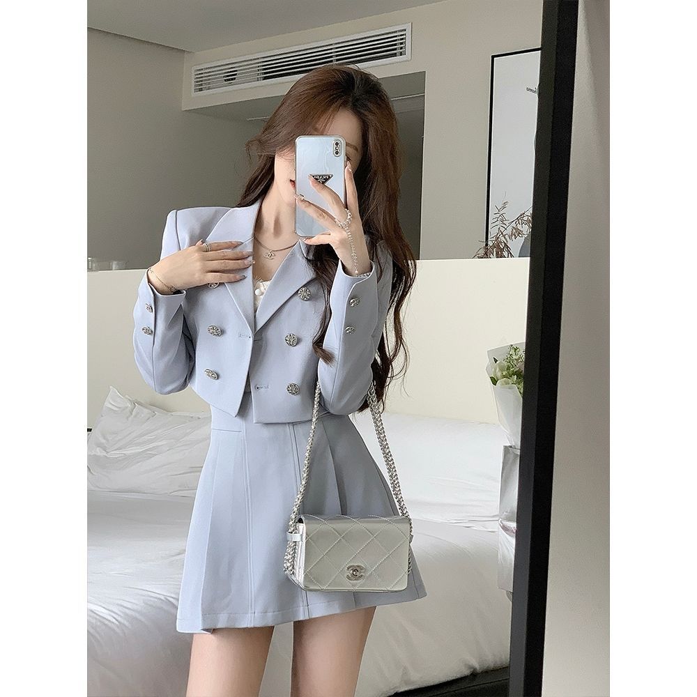 2024年春の女性韓国版新作涼しく楽ちんセットアップヘイズブルー小香風ショートスーツジャケットハイウエストハーフスカートスーツ セットアップ