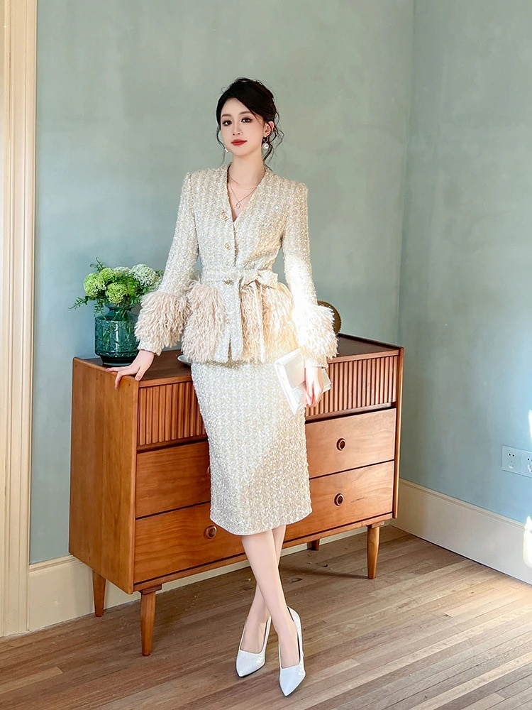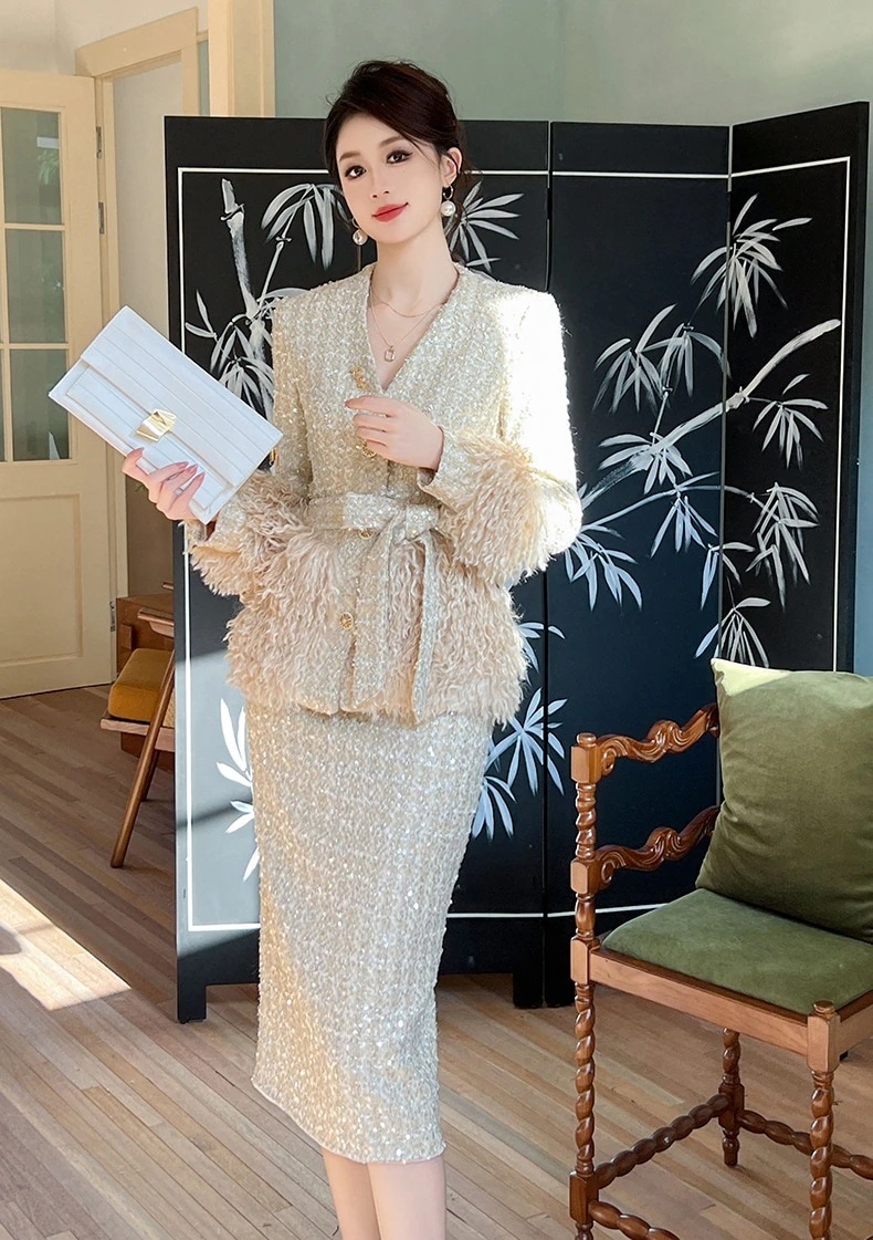 上下2セット ラジャー キラキラ ジャケット+スカート 冬 厚手 ファー飾り レディース セットアップ セットアップ