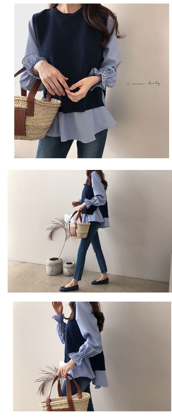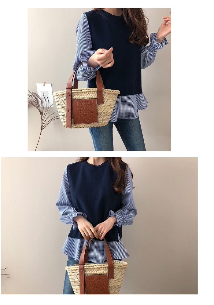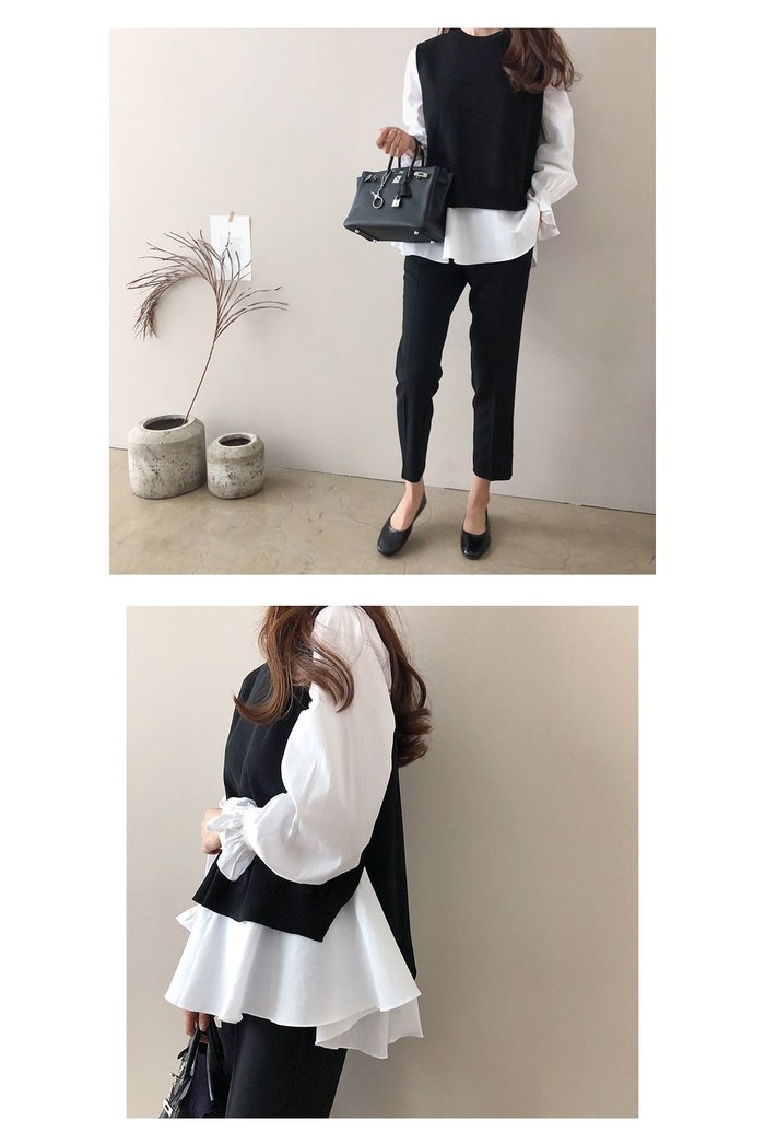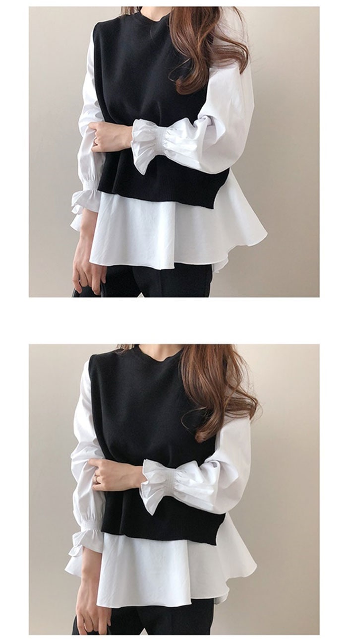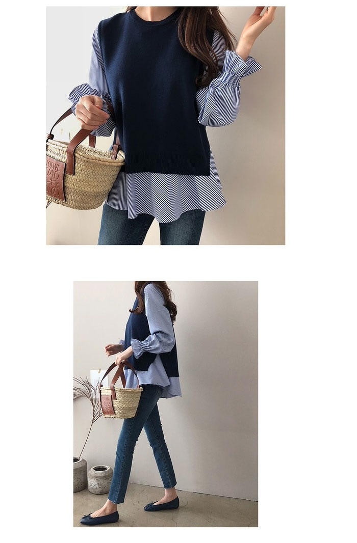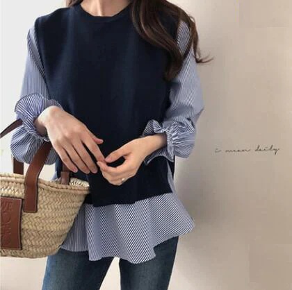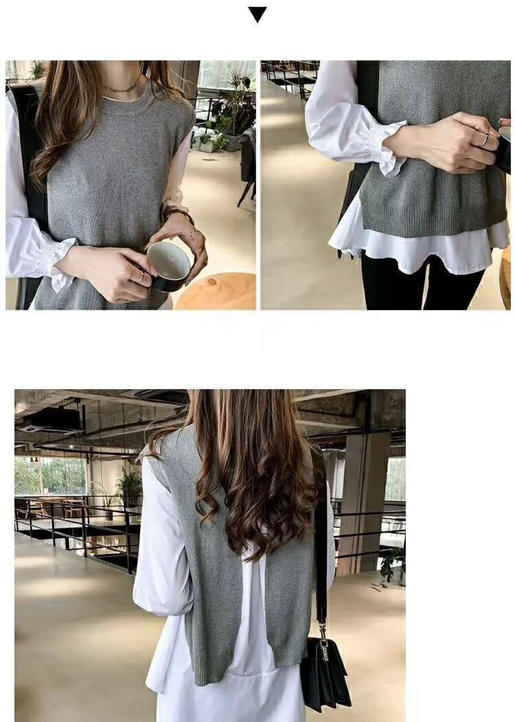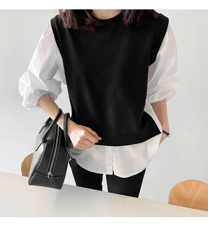 韓国 ファッション レディース 2点セット 春夏新作 切り替え 重ね着風 シンプル長袖 おしゃれ 可愛い トップス カジュアルクルーネックゆったりシャツ