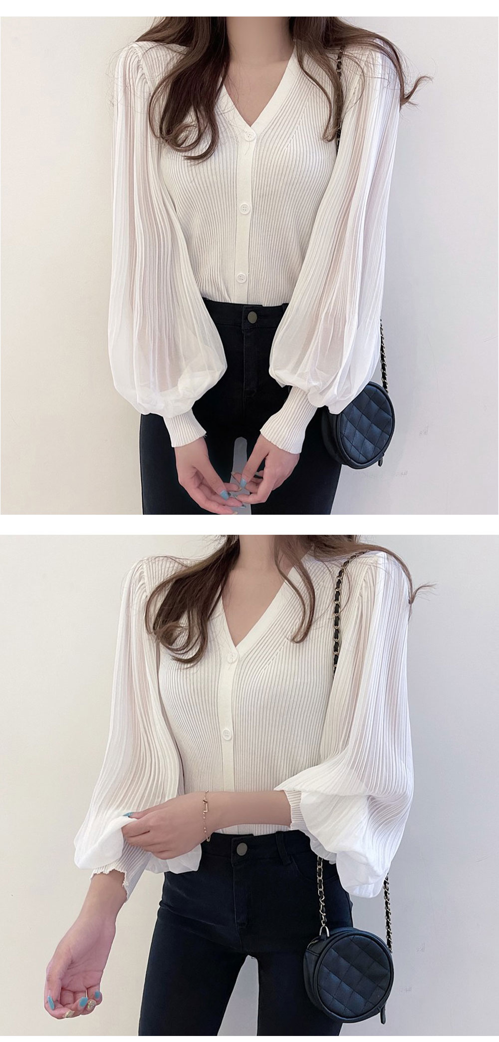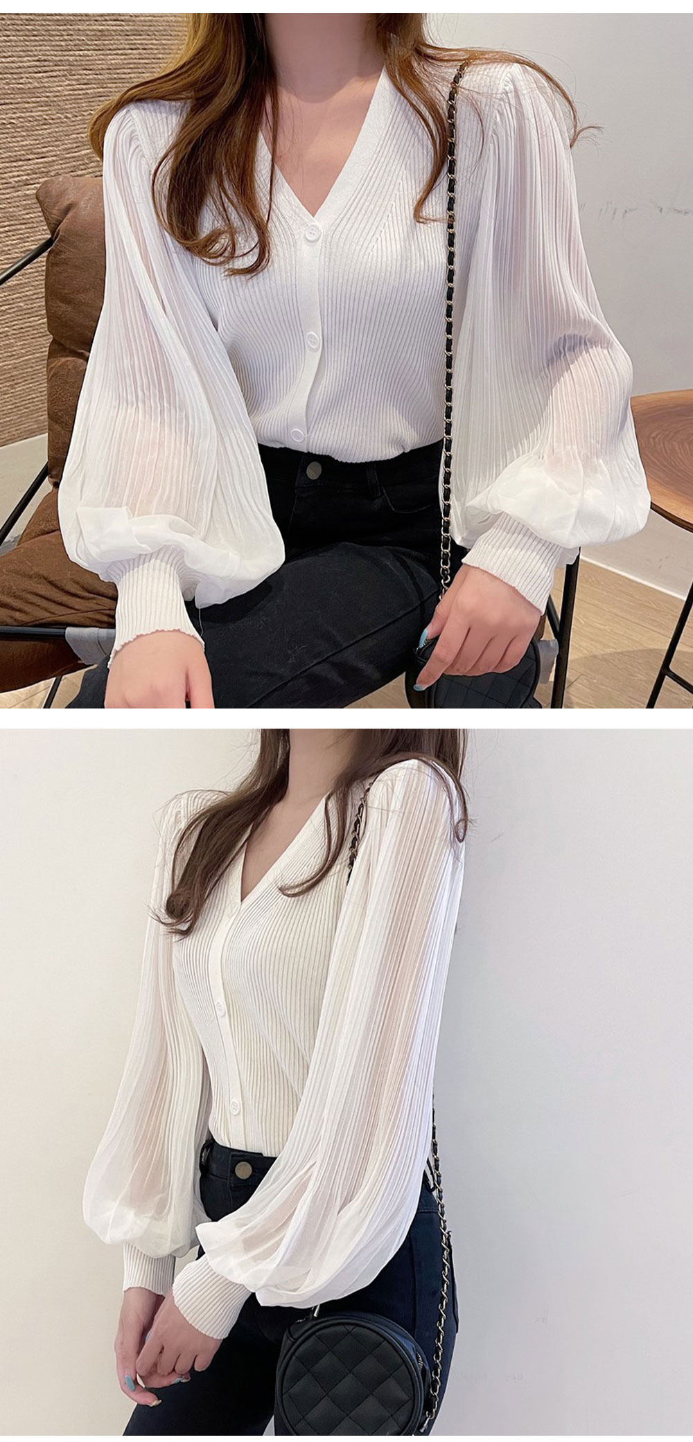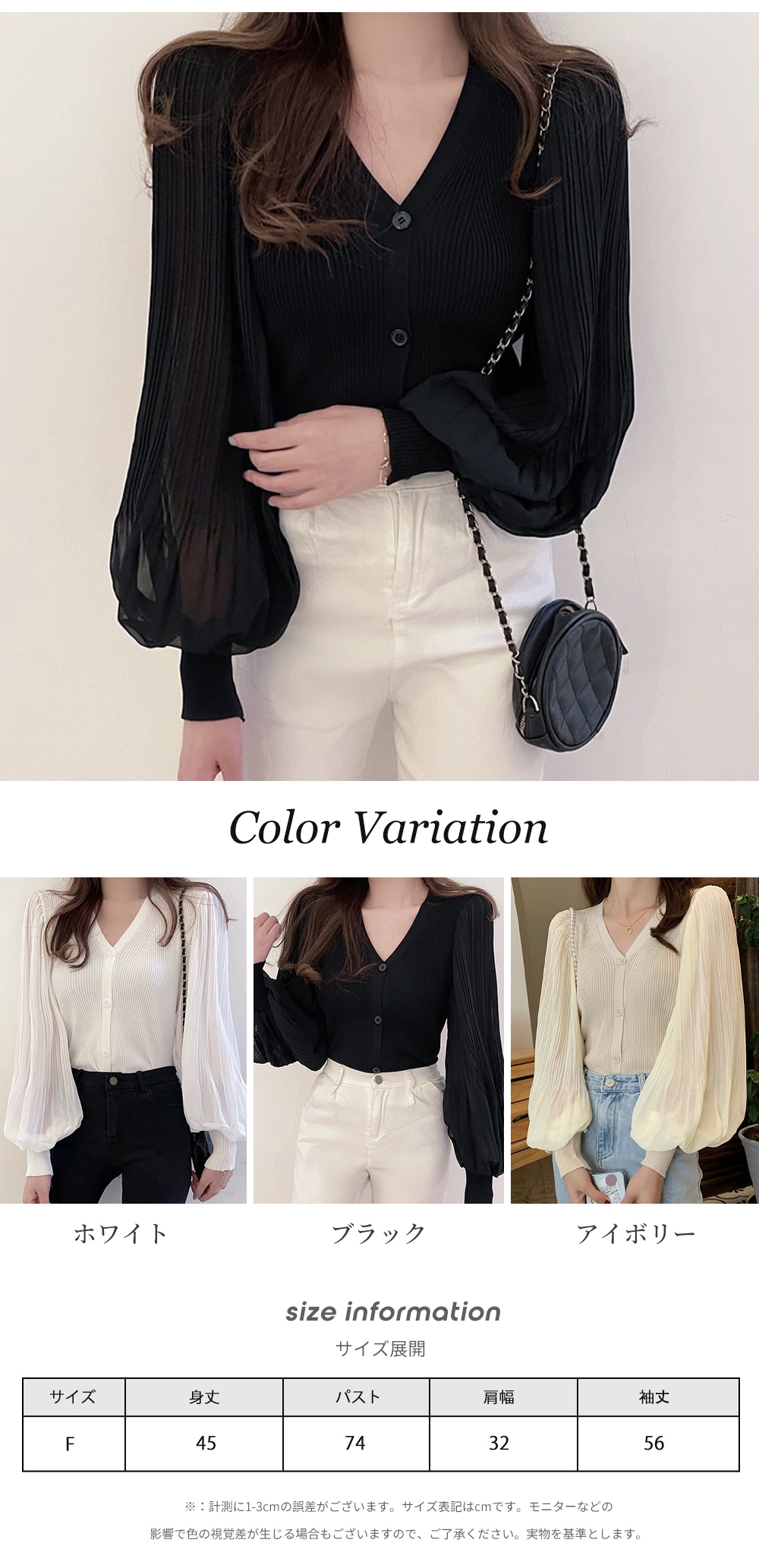 春 秋 長袖 ブラウス ニット ドッキング トップス レディース 切り替え シアー袖 ボリューム袖 レイヤード風 重ね着風 ニットトップス プルオーバー 薄手 ボタン付き 大人 かわいい
