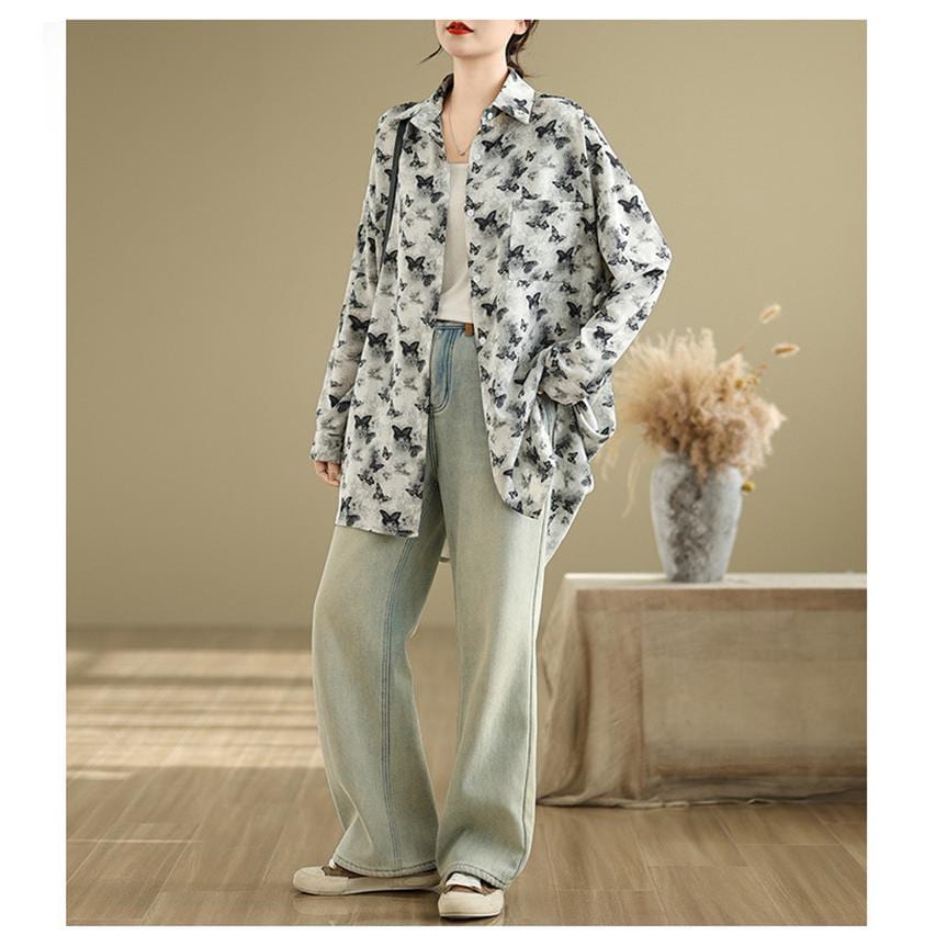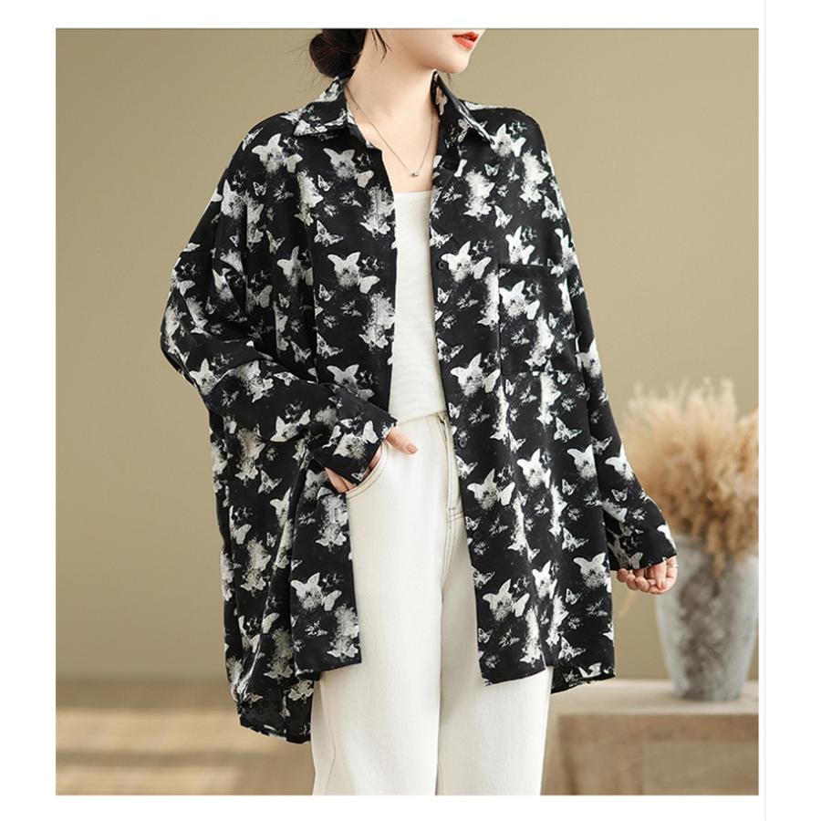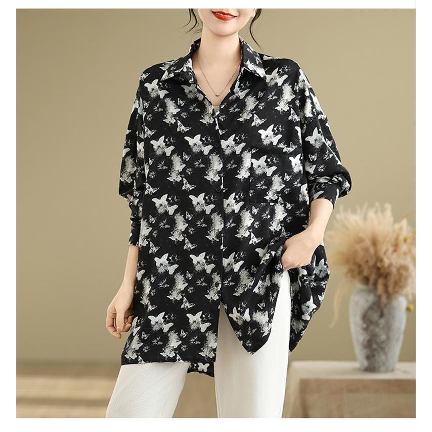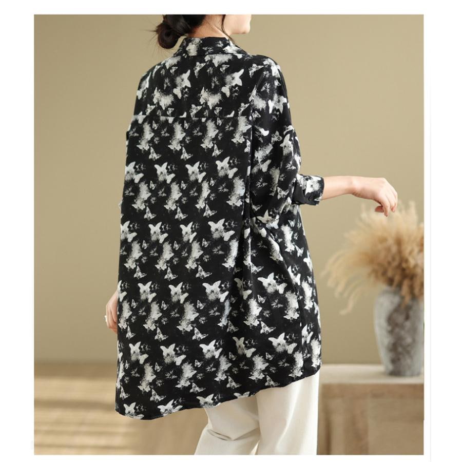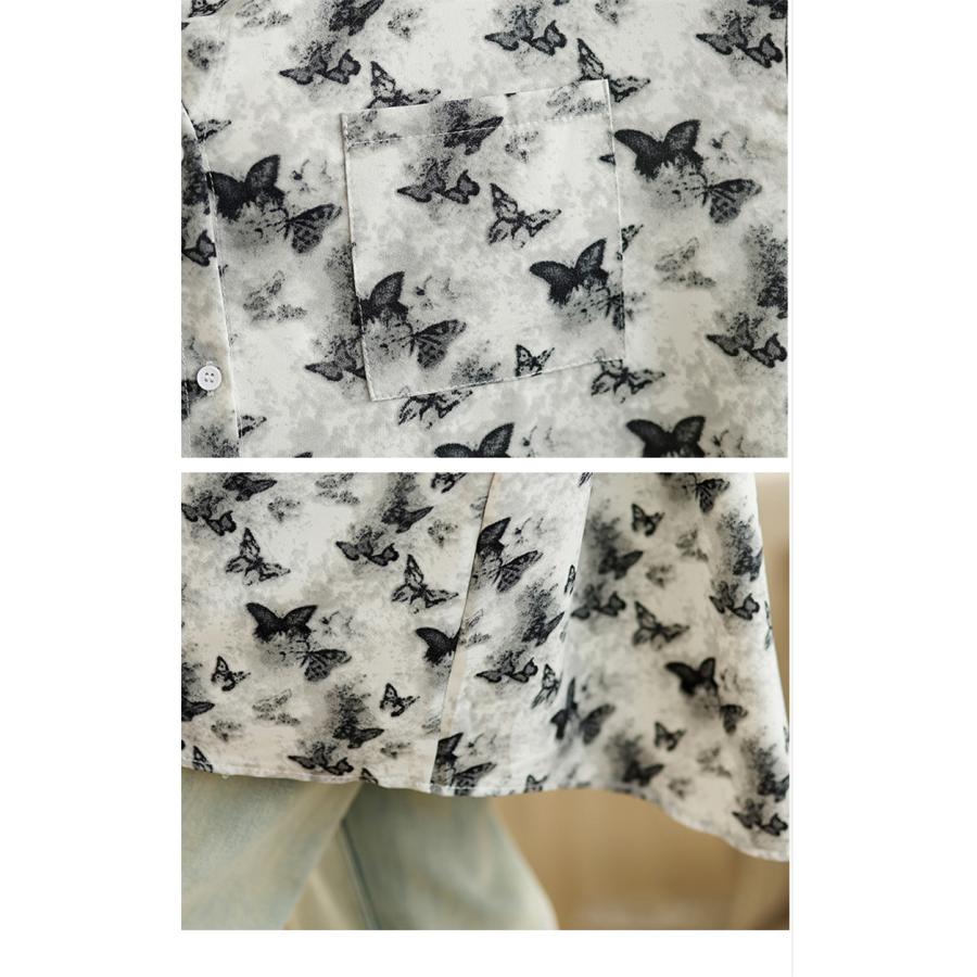 シャツ レディース トップス 春新作 ブラウス 羽織り 大人世代のカジュアルスタイルにぴったり 大人気 長袖 蝶々柄 オーバーシルエット 大きいサイズ