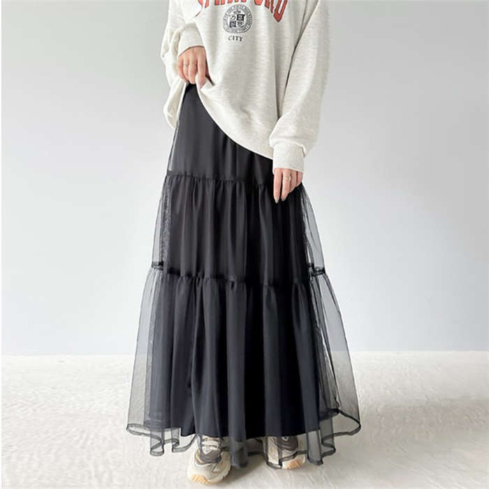 チュールスカート レディース フレア スカート 春 夏 秋 冬 無地 チュールスカート ロング ボリューム Aライン チュール ティアード ボトムス ウエストゴム 体型カバー 可愛い ダンス 衣装 社