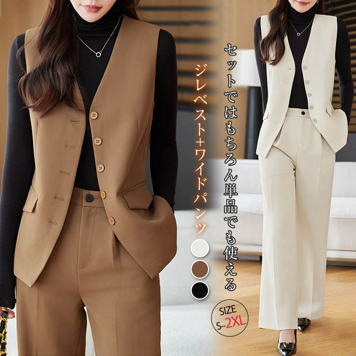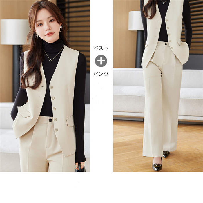 スーツ パンツスーツ レディース ジレ ベスト スラックス ビジネススーツ 無地 リクルートスーツ レディーススーツ セットアップ ノーカラー ジレ ベスト vネック ワイドパンツ フォーマル 上品