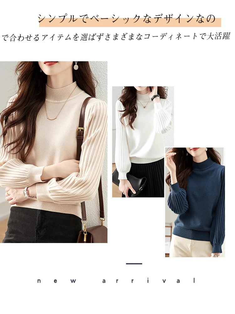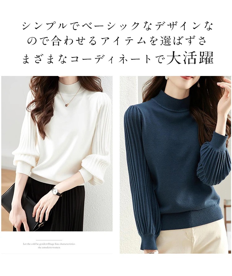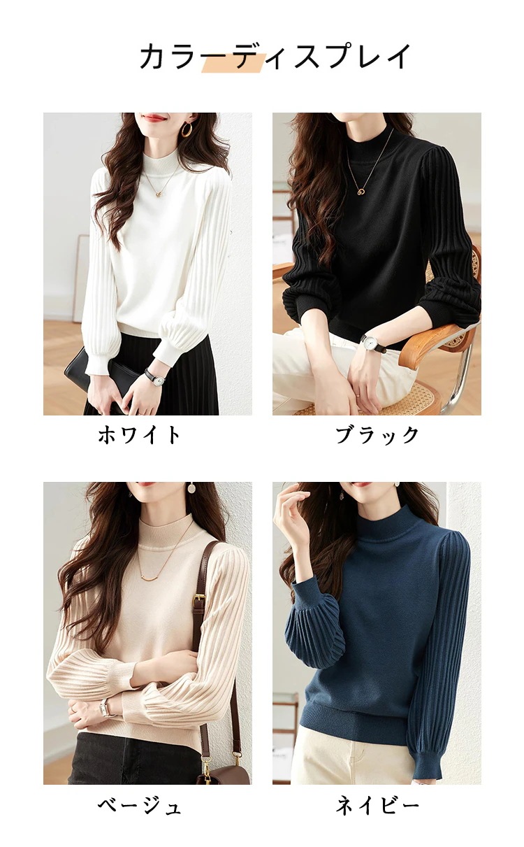 トップス ニットセーター レディース ぽわん袖 リブ ニットモックネック 二の腕カバー プリーツスリーブ セーター ハイネック 長袖 プルオーバー レディースファッション 通勤