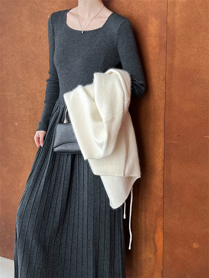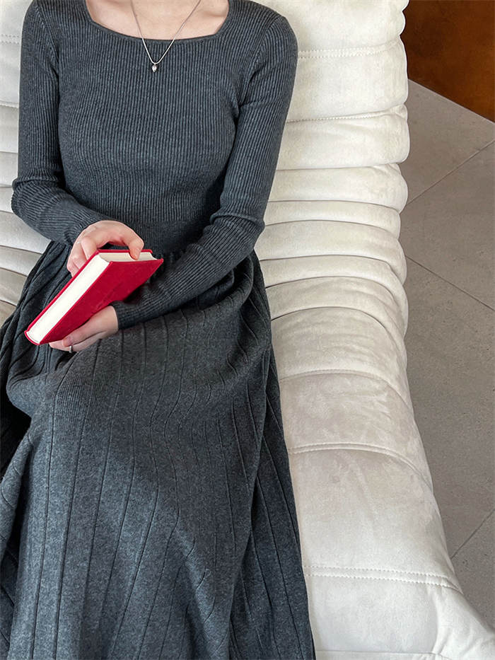 ニットワンピース ワンピース ニット リブ リブニット 秋冬 ニットワンピ きれいめ 長袖 ロング フレア プリーツ 袖あり ロング丈 マキシ丈 スクエアネック ワンピ マキシワンピース プリーツスカ