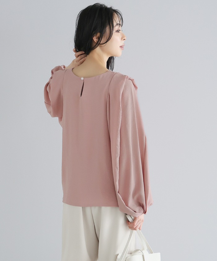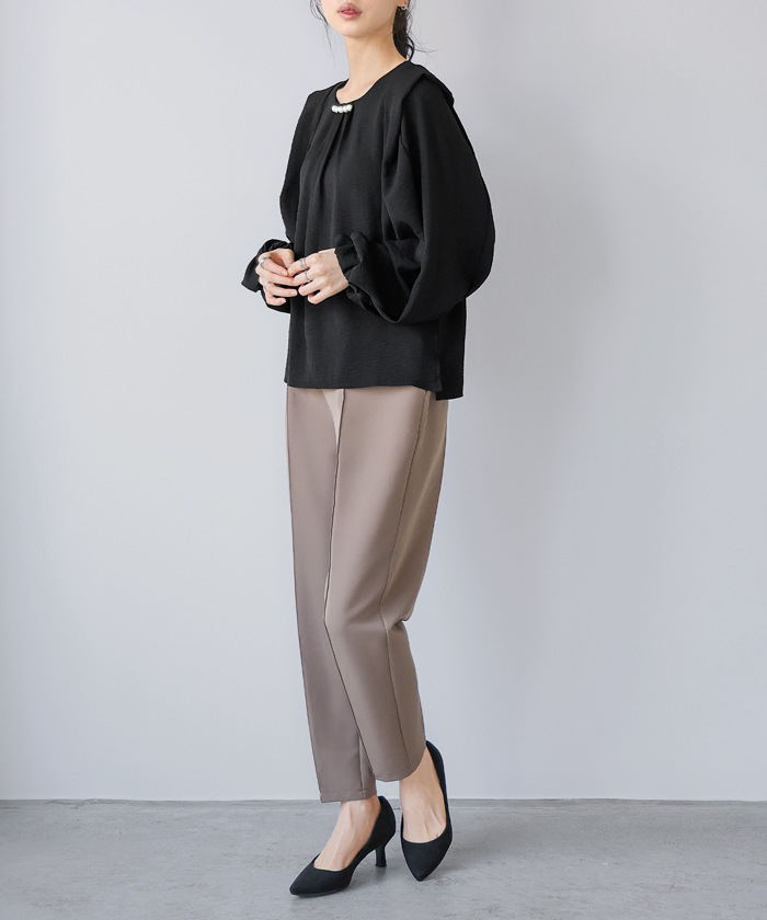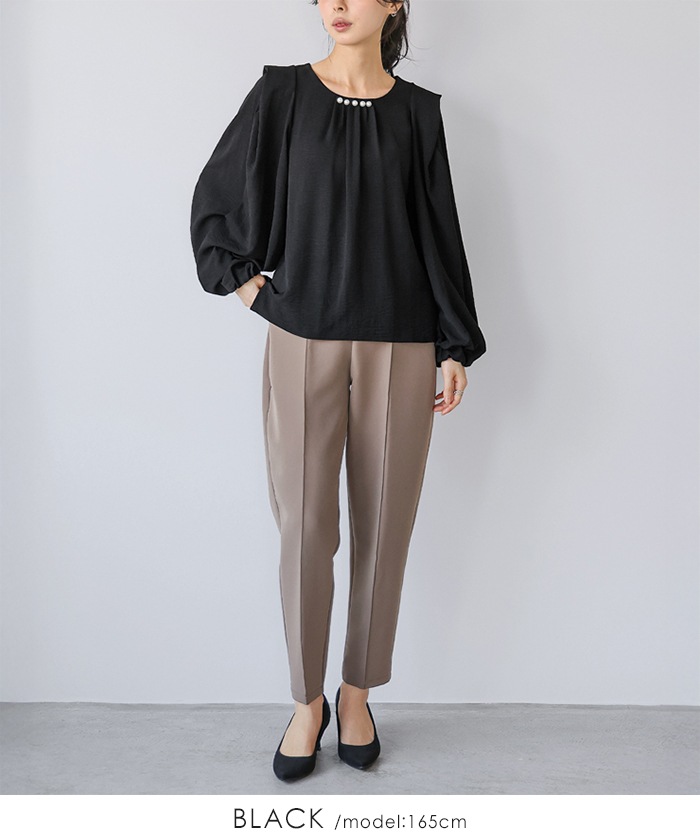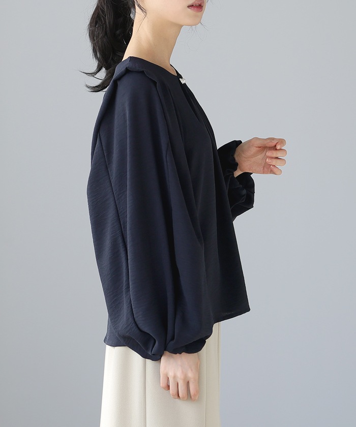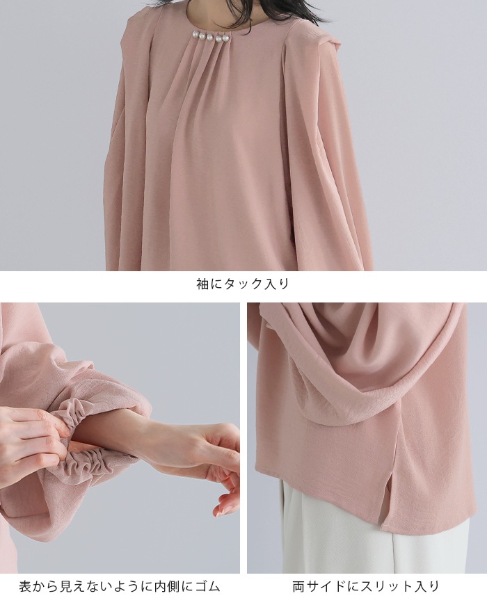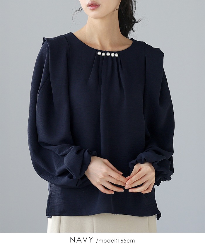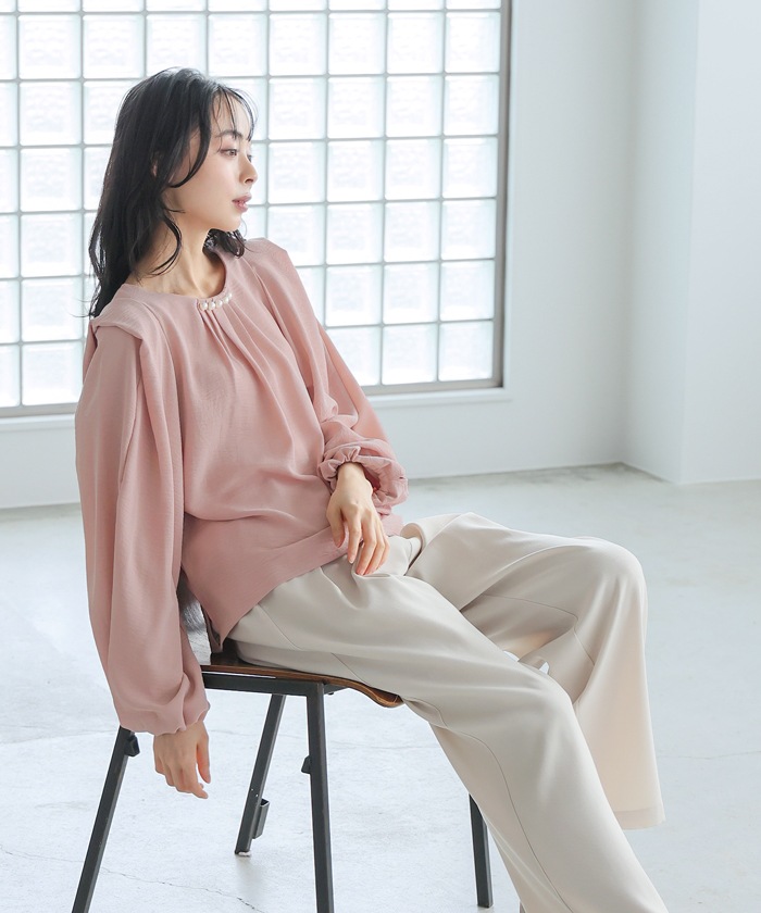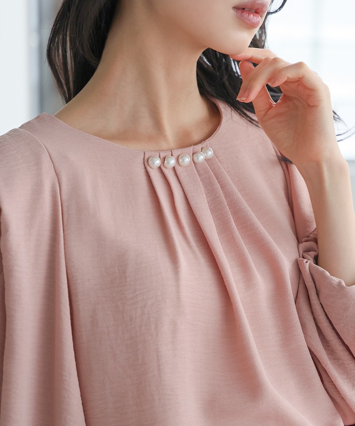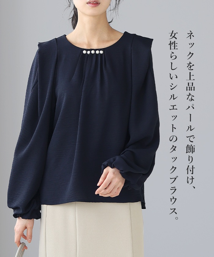 ネックにタックを入れ、その上にパールをあしらったブラウス。