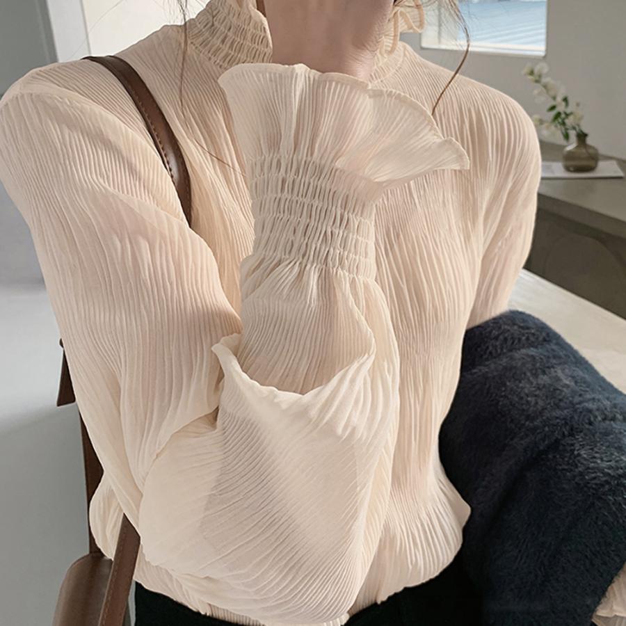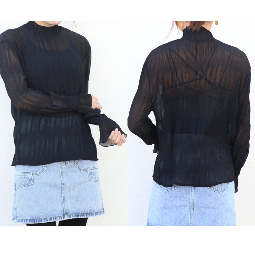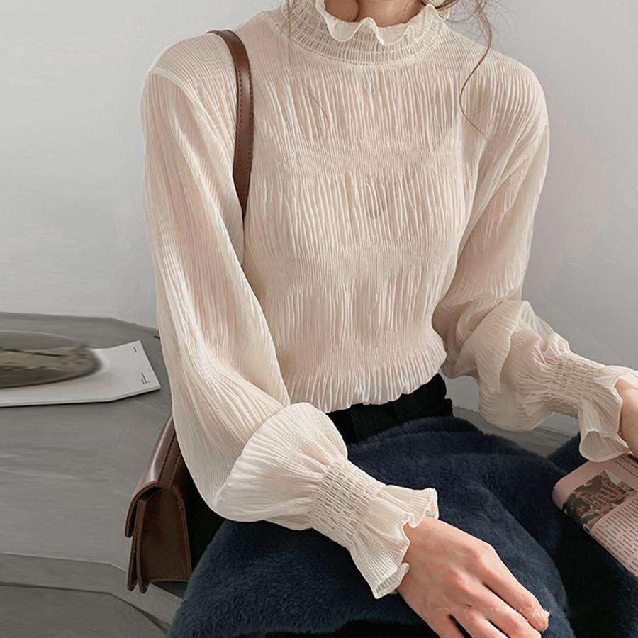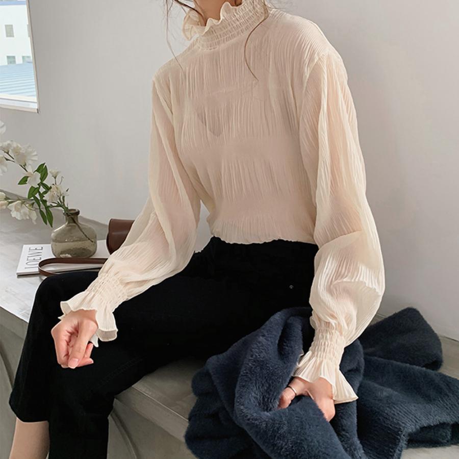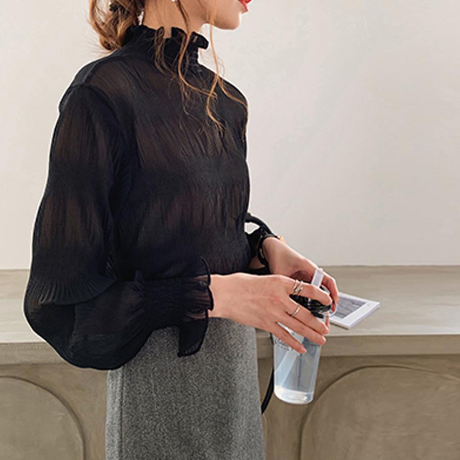 今っぽシアーシャツ レディースファッション メロウフリル ハイネックブラウス 韓国風 シャツ ブラウス