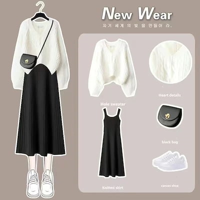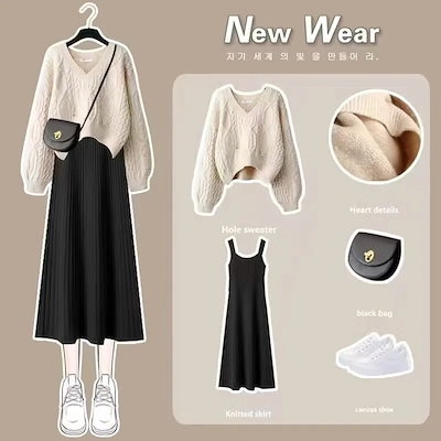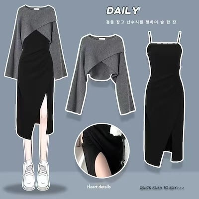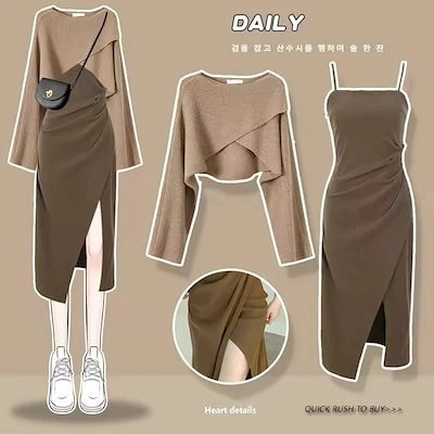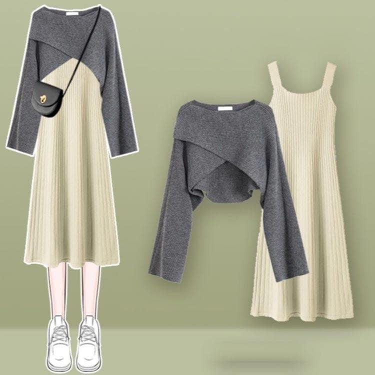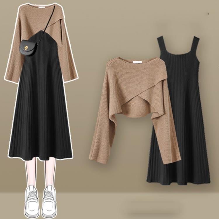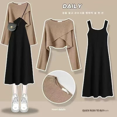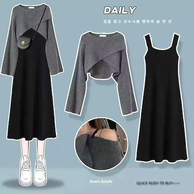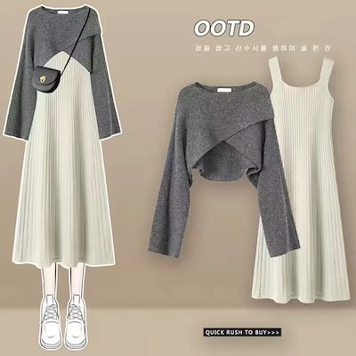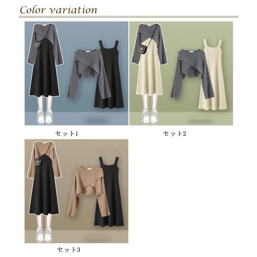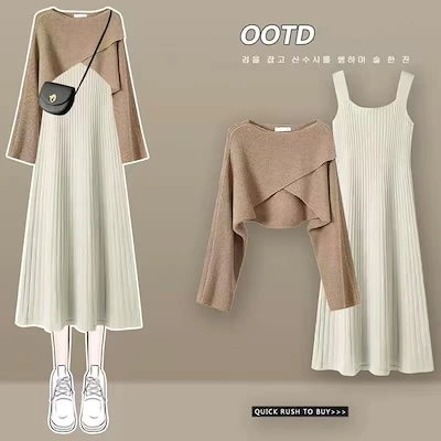 人気商品超目玉 ニットセットアップ 2点セット レディース 春秋 秋冬 ニット セーター クロス 長袖 フレアスワンピース ミモレ丈 ワンピース ロングワンピース き