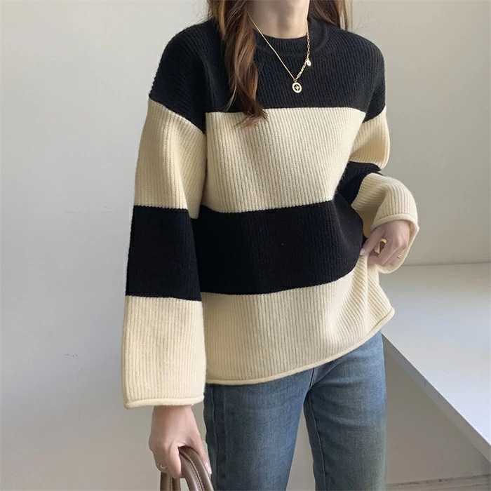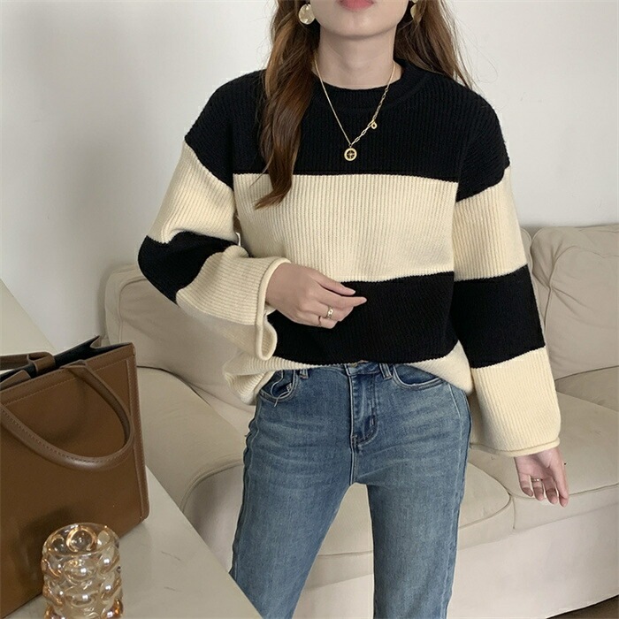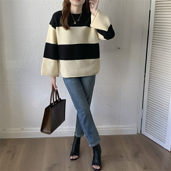 セーター レディース ニット ニットセーター 秋冬 長袖 グルーネック 配色 インナー ボーダー柄 ボーダー柄セーター 長袖ニット 秋冬 ニットセーター プルオーバー ニットソー ニットトップス 長袖