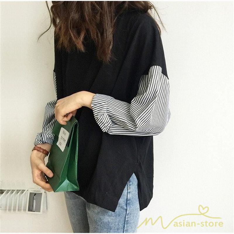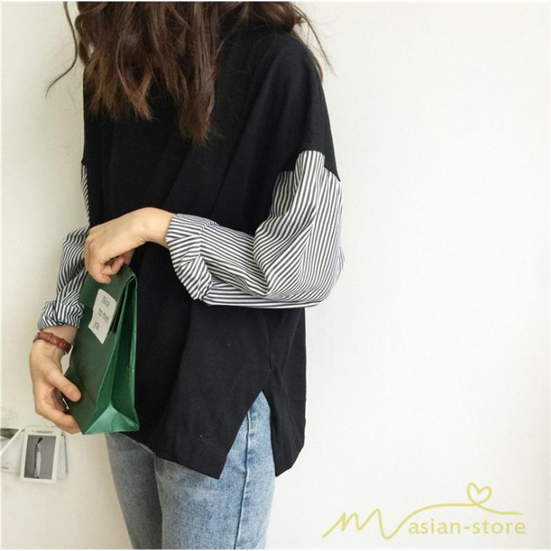 tシャツ カットソー レディース 春物 春夏秋 丸首 長袖 異素材 切り替え 黒tシャツ 白tシャツ サイドスリット ワイドシルエット 無地 ストライプ コットン