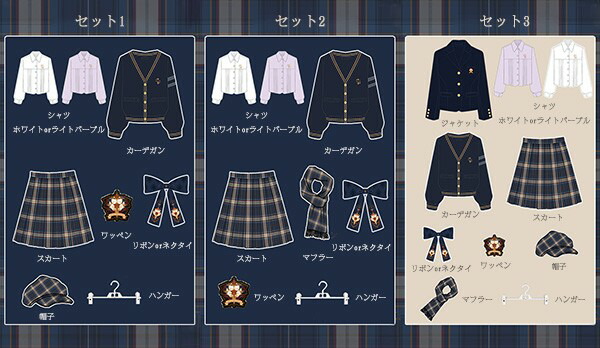 セット3(別途5620円):カーデガン/シャツ/スカート/リボンorネクタイ/ワッペン/ハンガー/帽子/マフラー/ジャケット