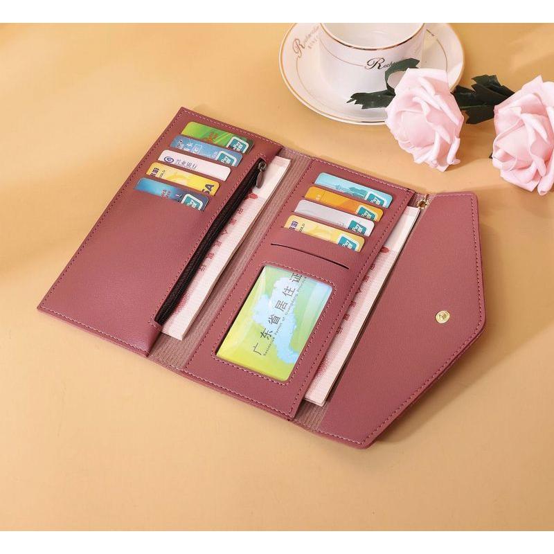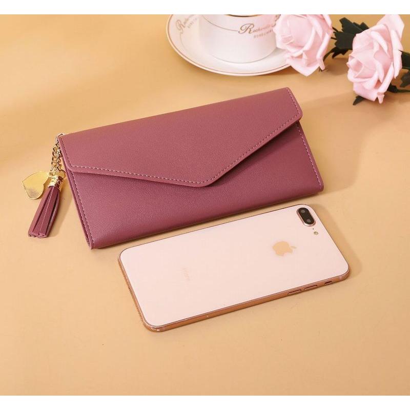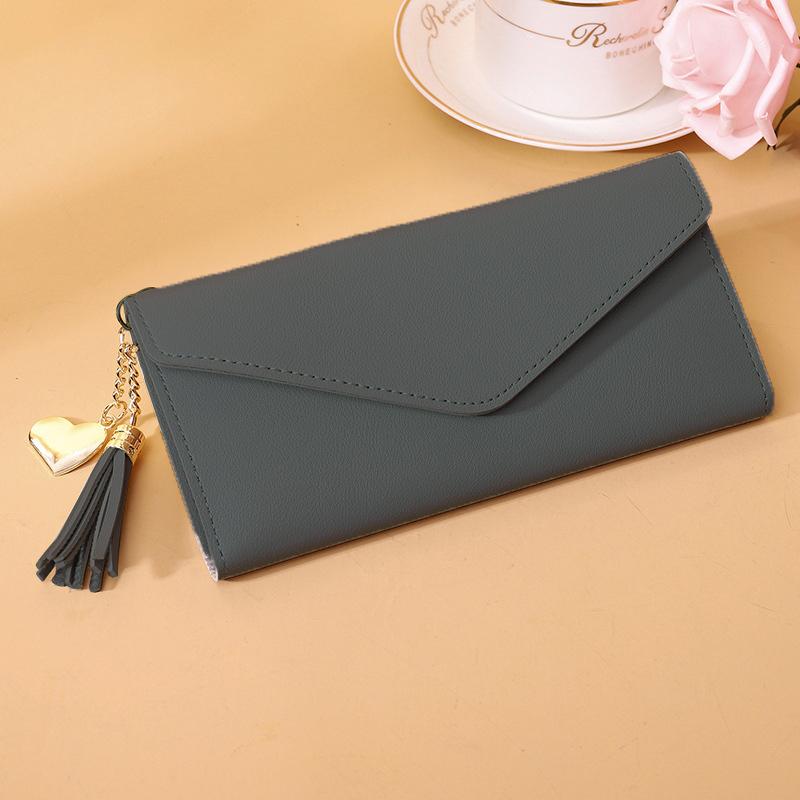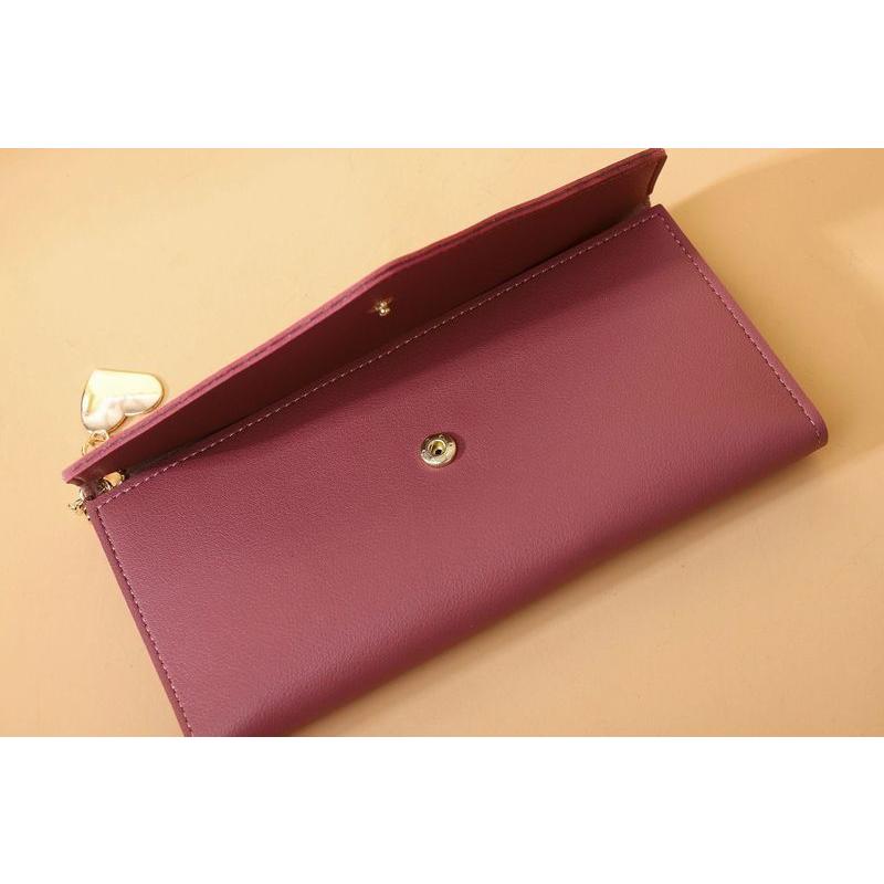 長財布 3つ折り 三つ折り レディース シンプル 無地 カード入れ 小銭入れ スナップボタン開閉 横長 レザー調 上品 タッセル ハートチャーム お札