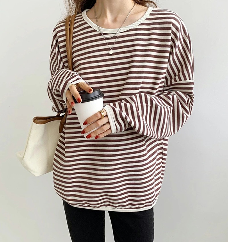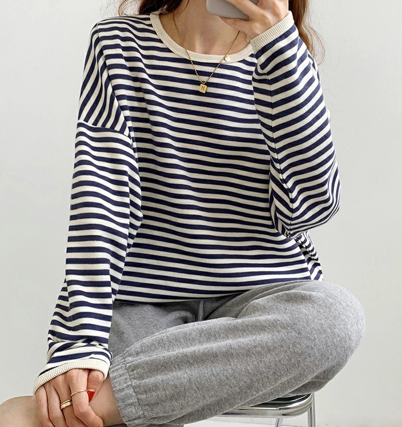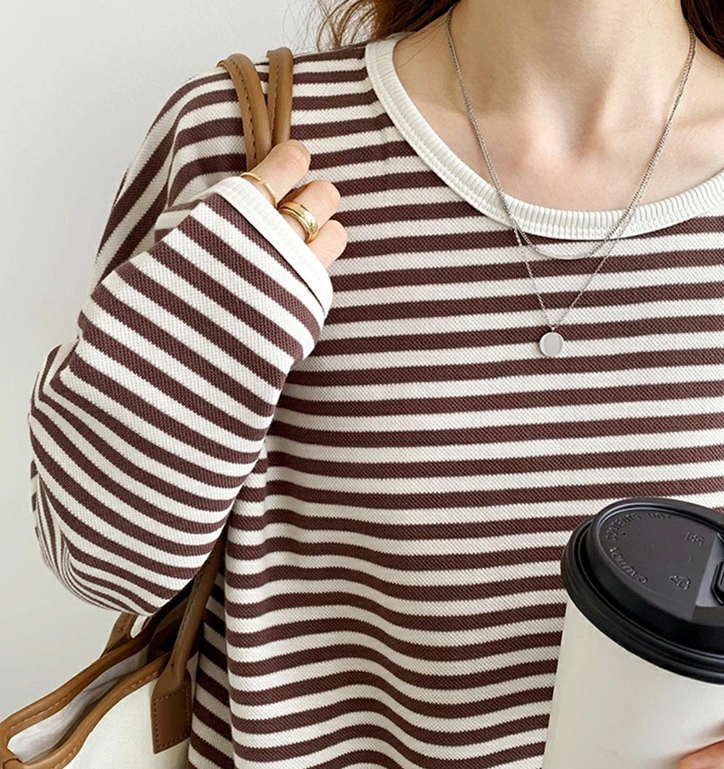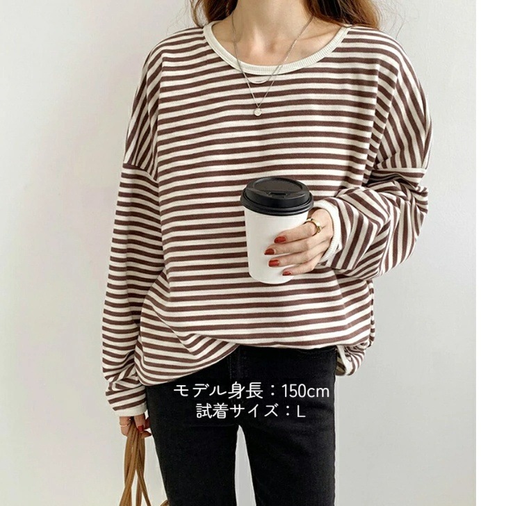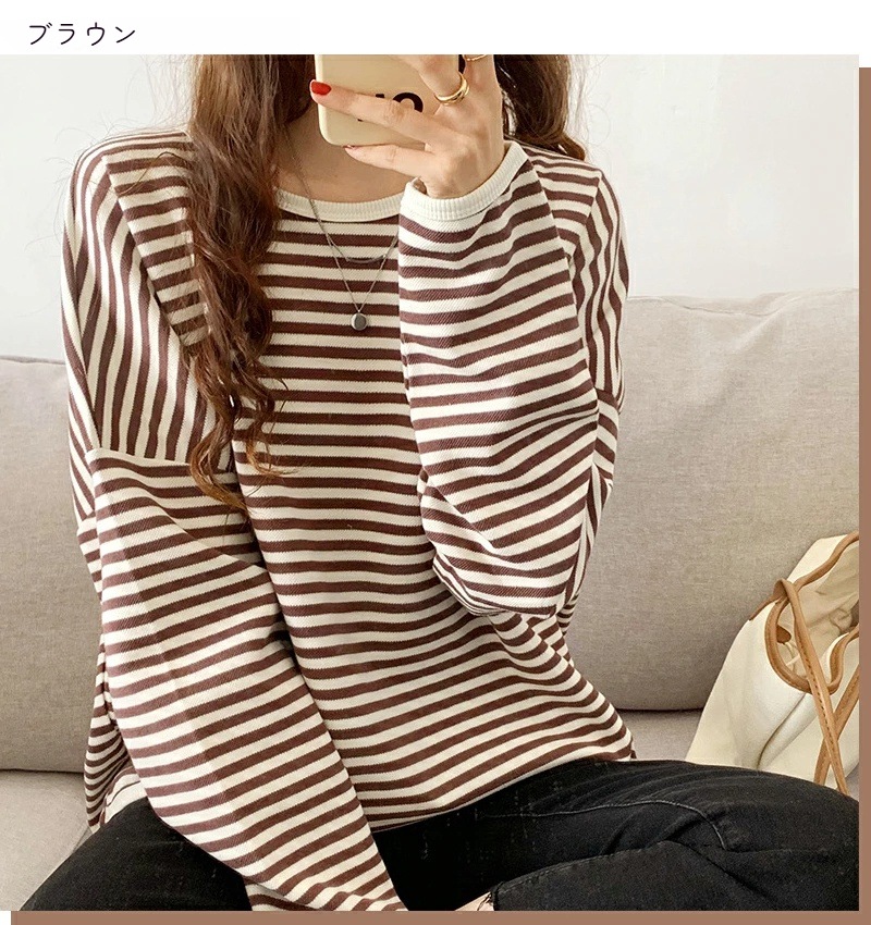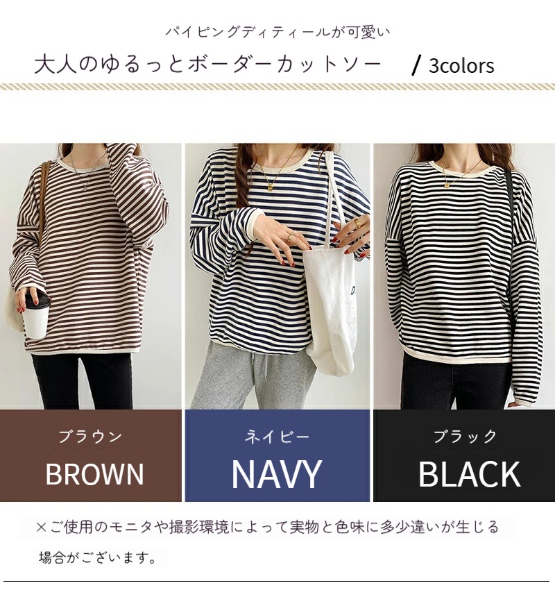 パイピング ボーダー カットソー 全3色 細縞 ラウンドネック オブロングネック ボートネック トップス 長袖 レディース カジュアル ナチュラル Tシャツ インナー オールシーズン 春 秋 冬 薄手